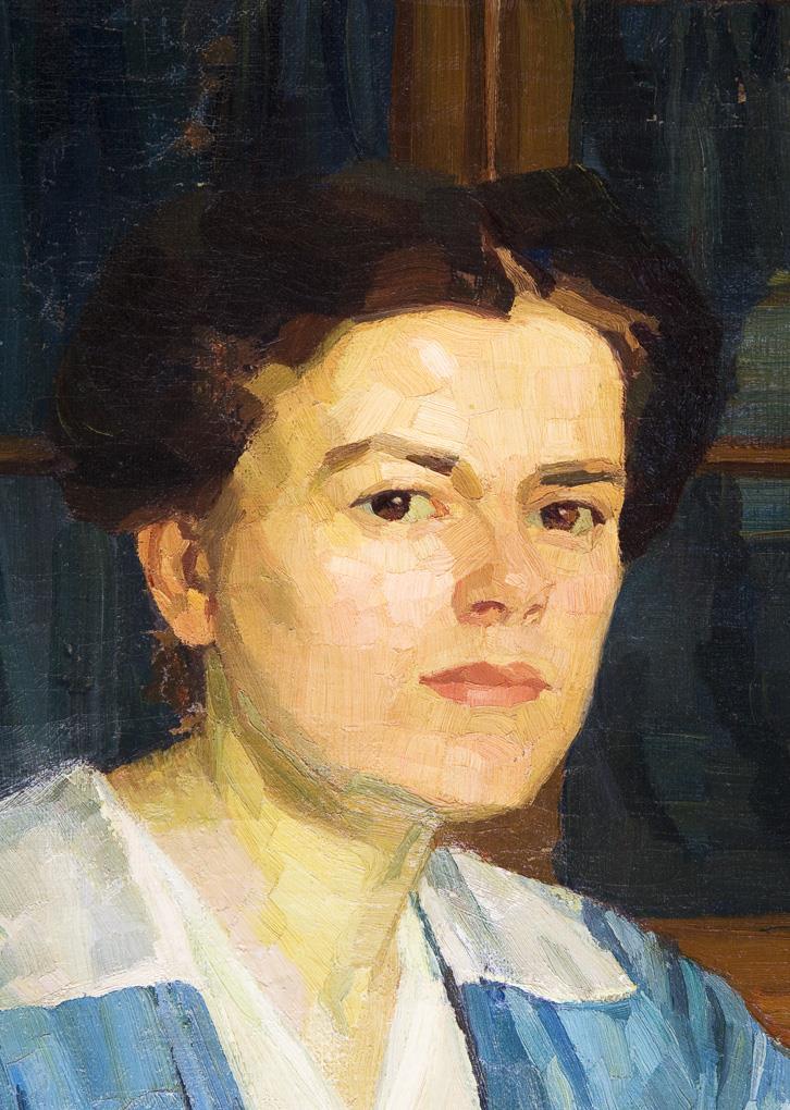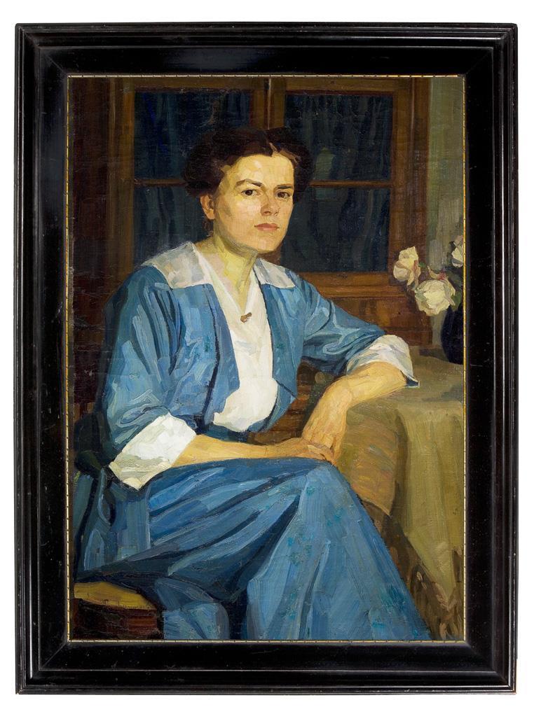 Circumference of the Munich artist association Scholle. A monumental so-called knee piece. A briskly painted and with a broad brush applied character portrait. The young lady presents herself proudly and confidently. Blackened profile frame. Wedge frame supplemented.