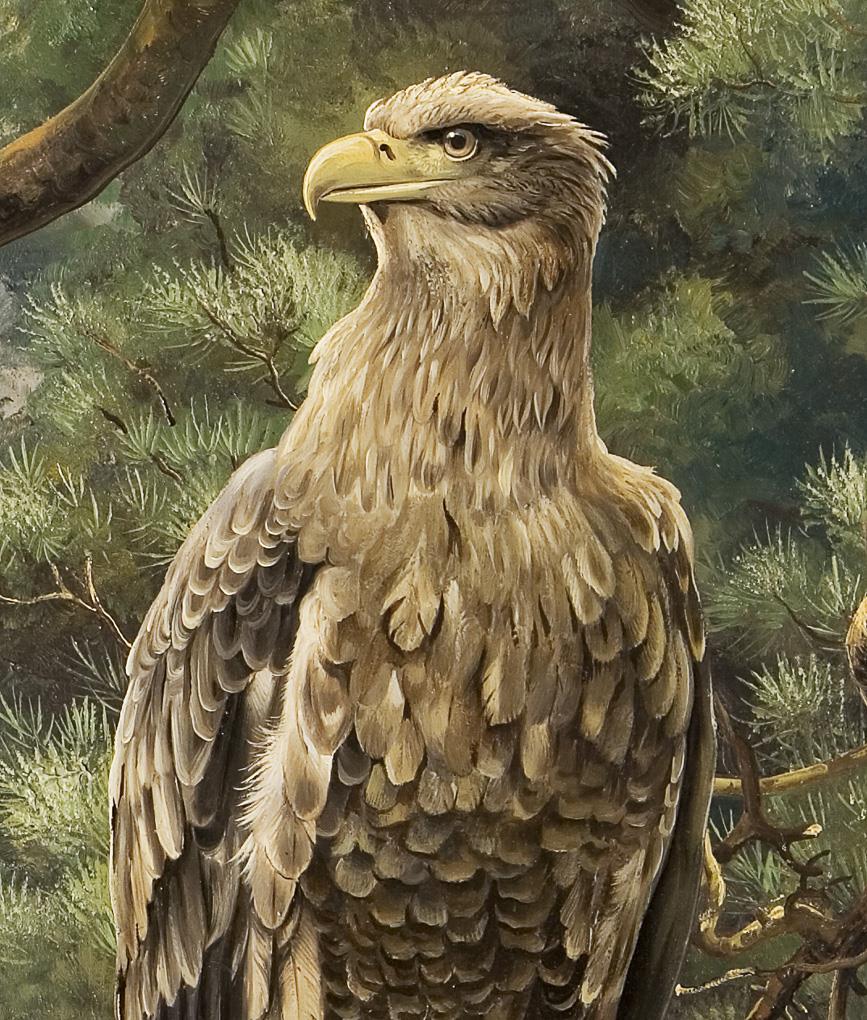 Animal representation with a careful inclusion in the scenic background. In an exact naturalistic painting style with a captivating technical virtuosity. Plain frame.