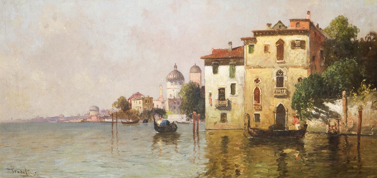 Canal scene in pronounced landscape format, right in the foreground gondolas in front of a house front in the sunlight, on the left side the view wanders into the distance. Original stretcher, profiled gold frame. A patch on the back.