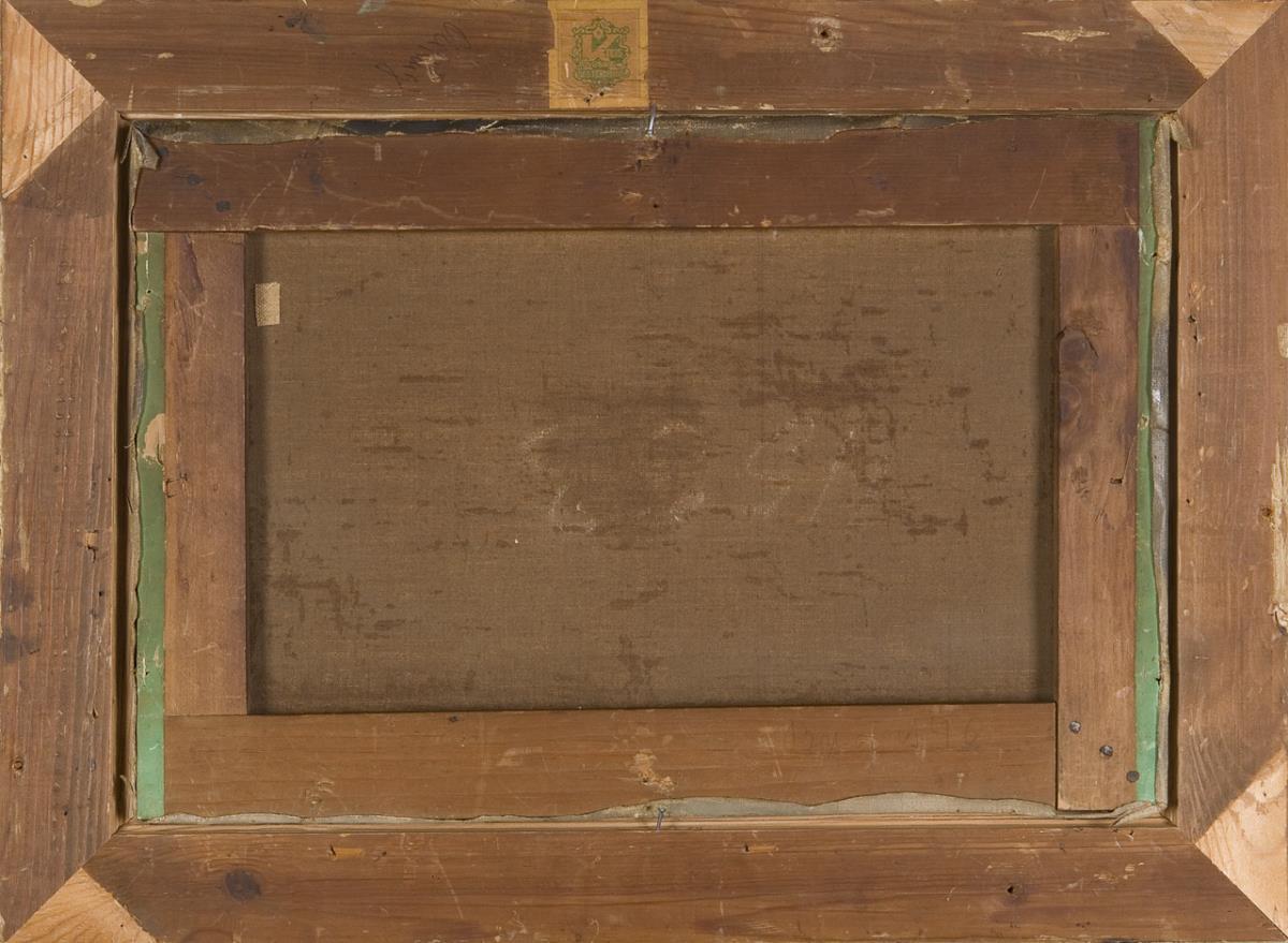Profiled gold frame. Small patch on the back above, frame partially defective.