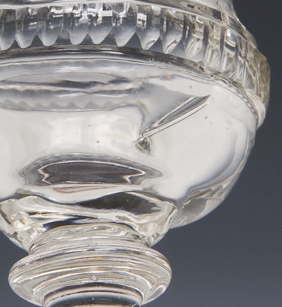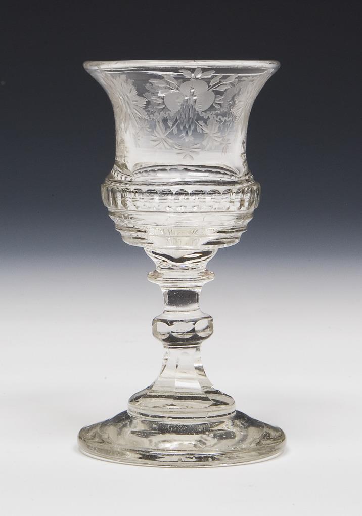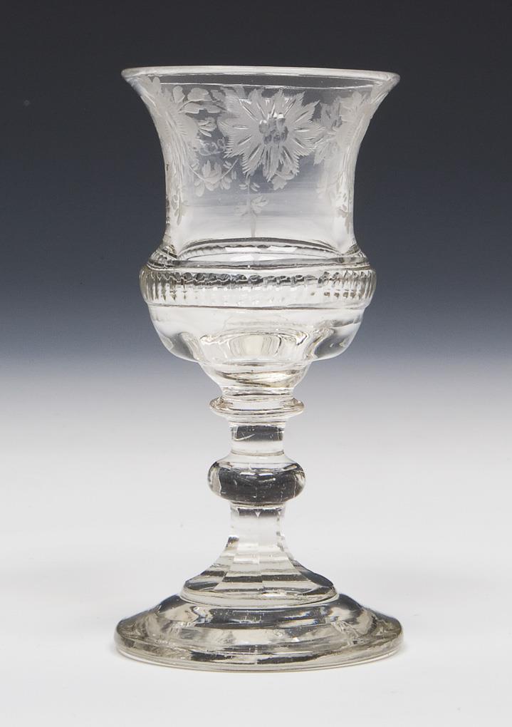 Elaborately refined fabless glass with cut and cut decoration. On the bell-shaped dome floral ornaments in matte and blank cut. Three glasses with fluted dome at base and faceted nodi, three glasses with smooth dome base and smooth nodi. One dome base with small defect.