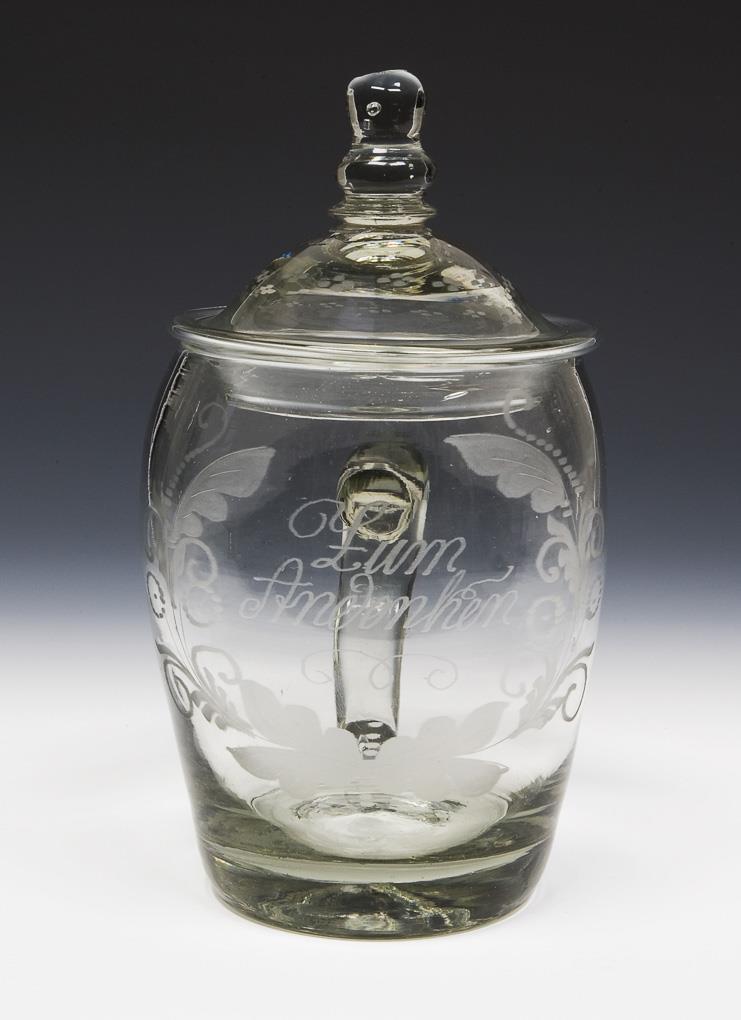 Colorless demolition glass with frosted decoration. Frontal floral reserve with inscription "Zum Andenken", barrel-shaped body with flared ear handle, slightly domed lid, baluster knob with demolition.