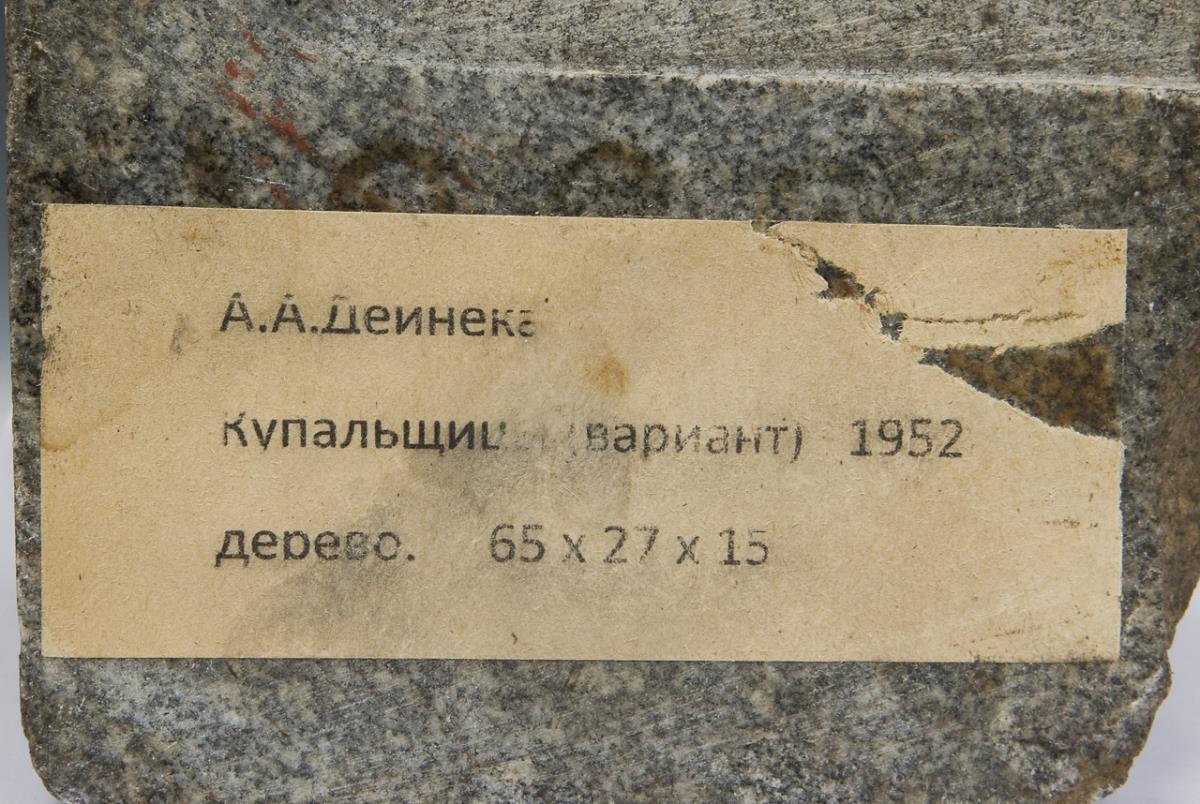 Fully plastic carved. Well-formed slender body with narrow waist. Natural granite plinth with adhesive label on bottom, inscribed in Cyrillic, dated: 1952. Rear vertically cracked, frontal crack restored.