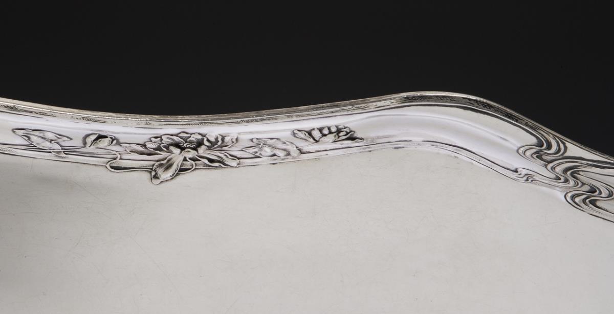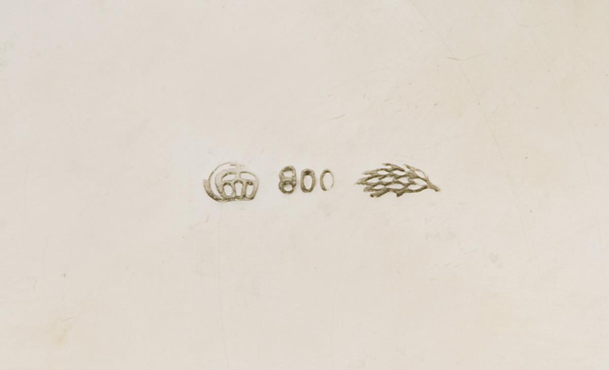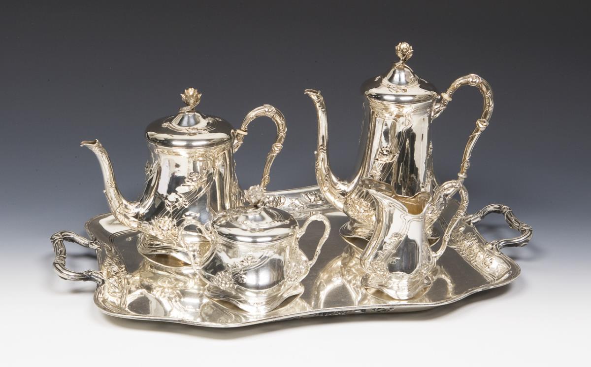 Floral relief, can lid with hinge. 5 parts: Tray, coffee pot, tea pot, milk jug, sugar bowl. Hallmarks: Crescent and crown, fineness, factory mark. handle and knobs soldered, small scratches on the teapot, jug with small dents, stand uneven, spout of the coffee pot soldered at the base.