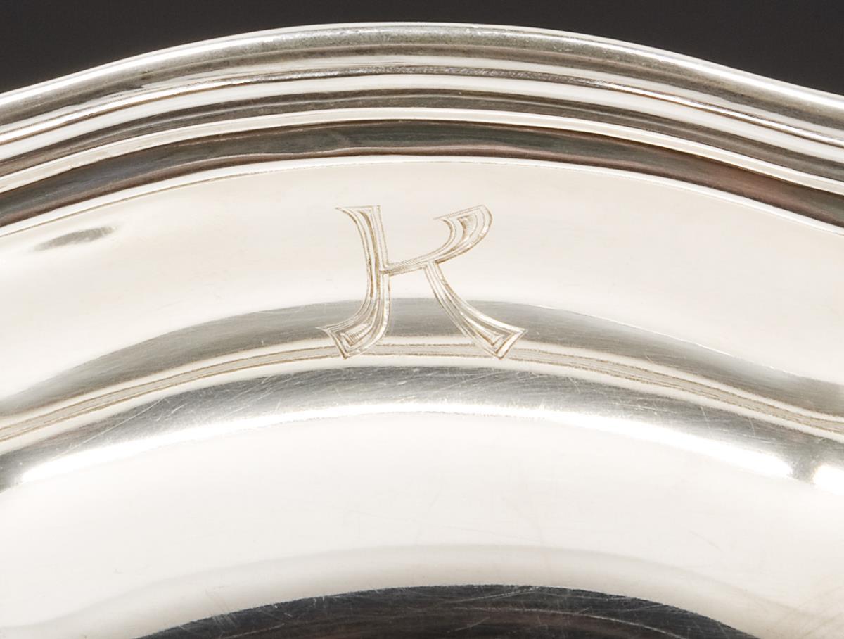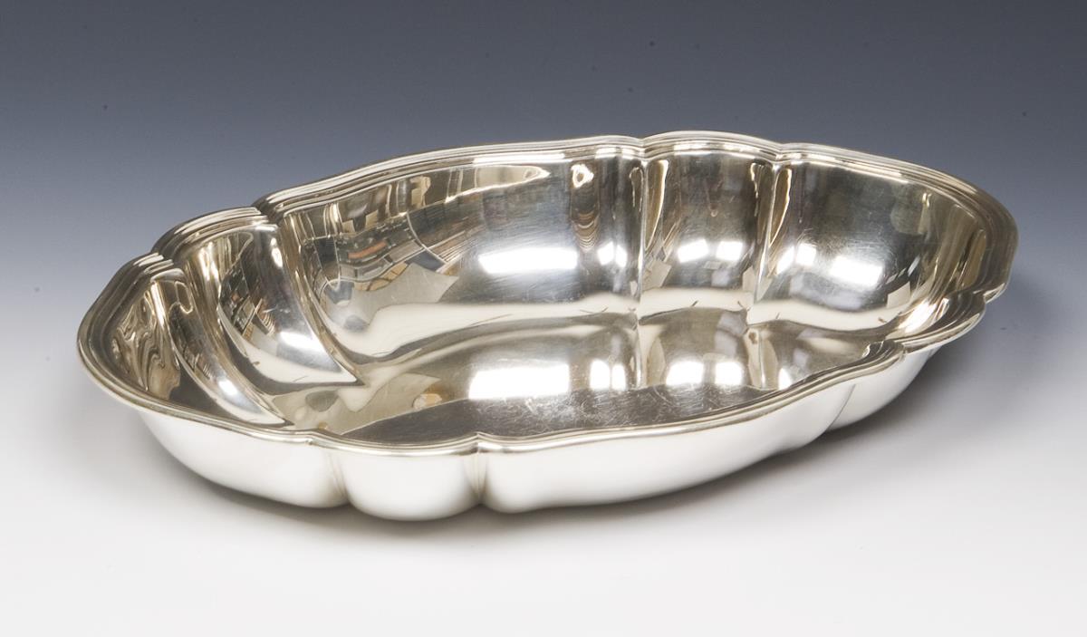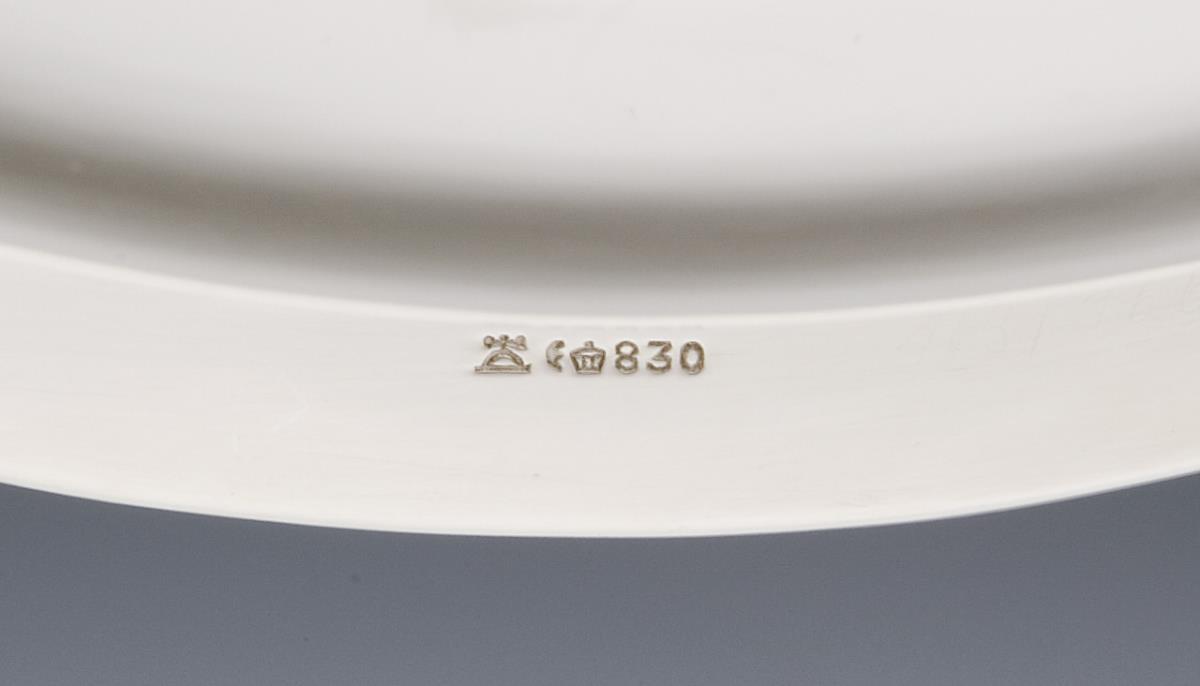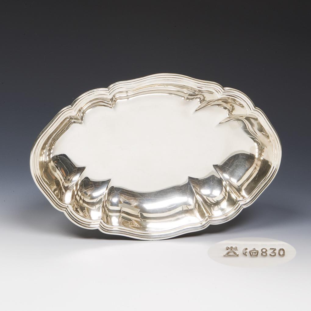 Oval curved shape with full profile rim. On the inner wall discreetly engraved monogram K. Hallmarks: Crescent and crown, fineness, factory mark.