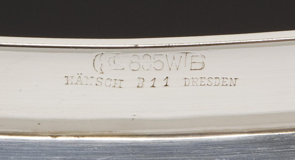 Curved square shape with full profile rim. Hallmarks: Crescent and crown, fineness, factory mark, seller's signature Hänsch, Dresden (jeweler Ferdinand Louis Hänsch, Saxon court supplier).