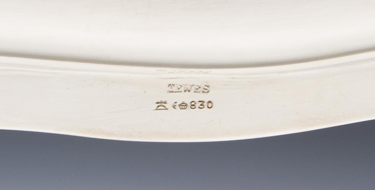Rectangular curved shape with full profile rim. Hallmarks: Crescent and crown, fineness, factory mark, seller signature Tewes (Jeweler, Dortmund).