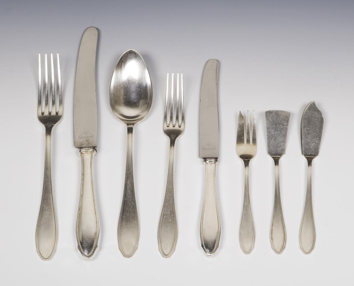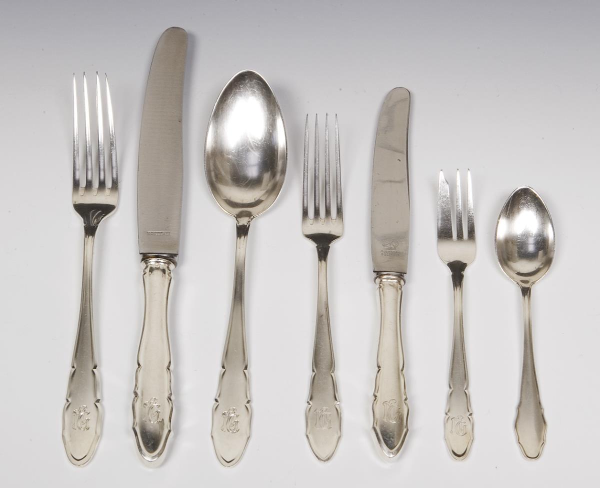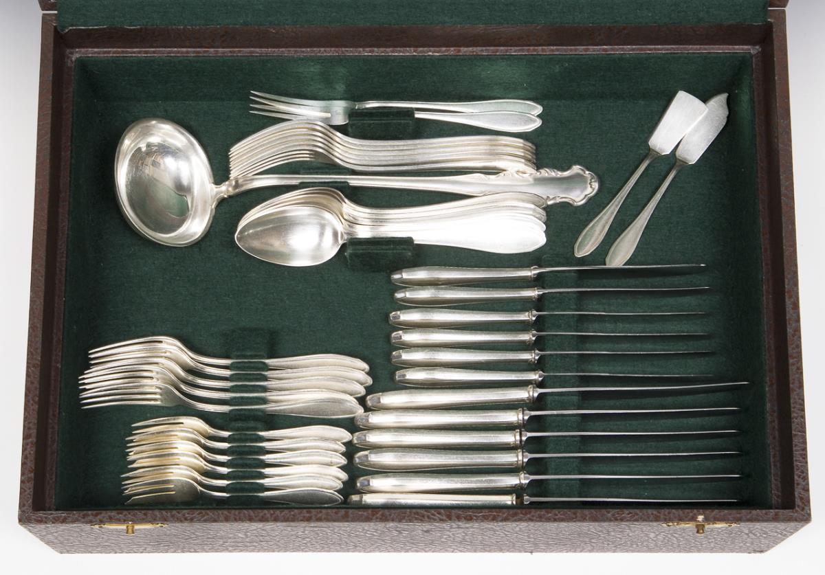 Remaining cutlery with engraved monogram MG: 36 pieces: 6 knives, 6 forks, 6 tablespoons, 6 menu knives, 6 menu forks, 6 cake forks. Remaining cutlery without monogram: 39 pieces: 6 knives, 6 forks, 6 tablespoons, 6 menu knives, 5 menu forks, 6 cake forks, 2 meat forks, butter knife, cheese knife. Knives with stainless blades. Hallmarks: Crescent and crown, fineness, factory mark. Coffee spoon (shape "Chippendale") and ladle Gebrüder Reiner, Krumbach (Bavaria, founded in 1874). Blade mounts of the large knives defective.