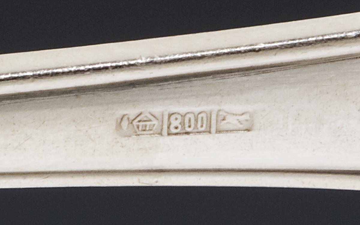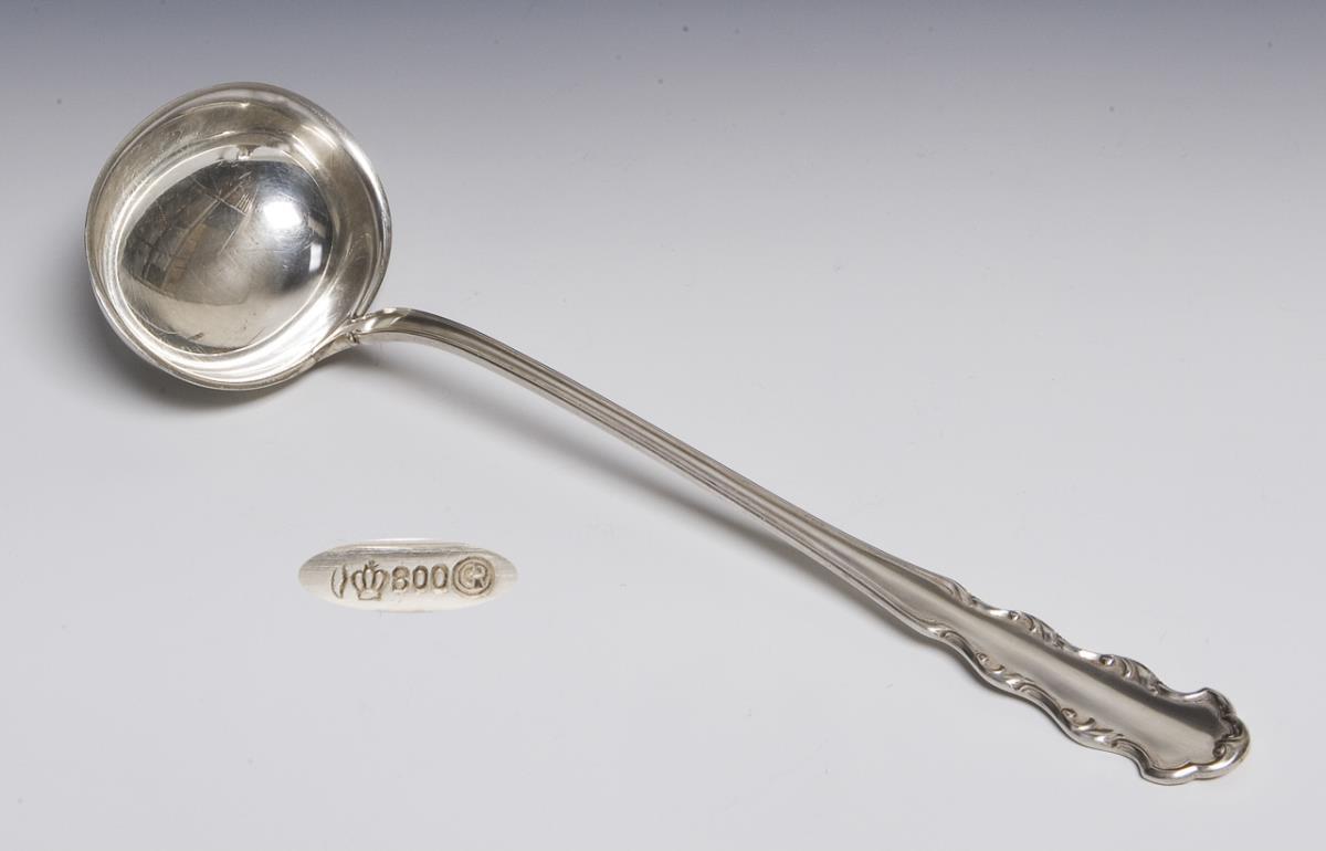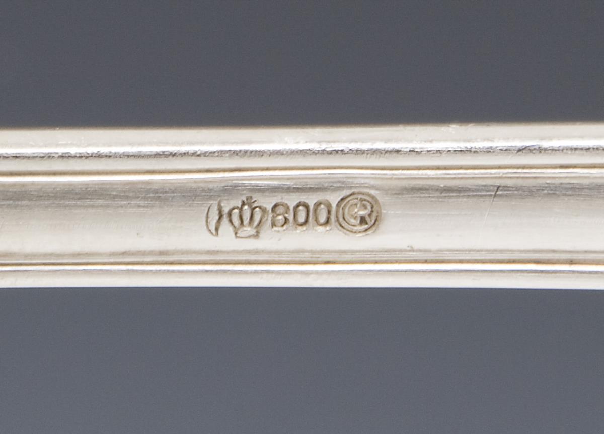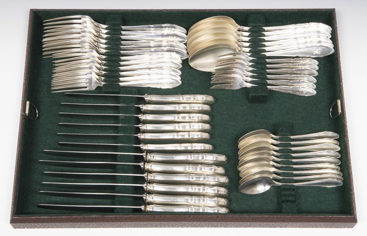 Remaining cutlery with engraved monogram MG: 36 pieces: 6 knives, 6 forks, 6 tablespoons, 6 menu knives, 6 menu forks, 6 cake forks. Remaining cutlery without monogram: 39 pieces: 6 knives, 6 forks, 6 tablespoons, 6 menu knives, 5 menu forks, 6 cake forks, 2 meat forks, butter knife, cheese knife. Knives with stainless blades. Hallmarks: Crescent and crown, fineness, factory mark. Coffee spoon (shape "Chippendale") and ladle Gebrüder Reiner, Krumbach (Bavaria, founded in 1874). Blade mounts of the large knives defective.