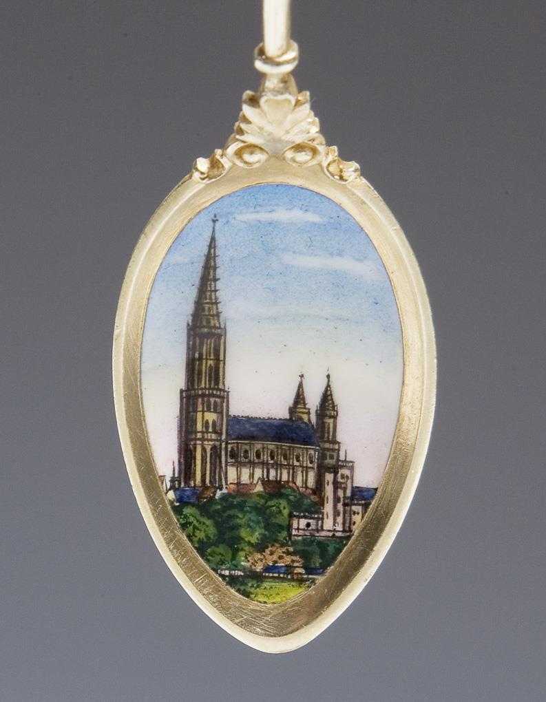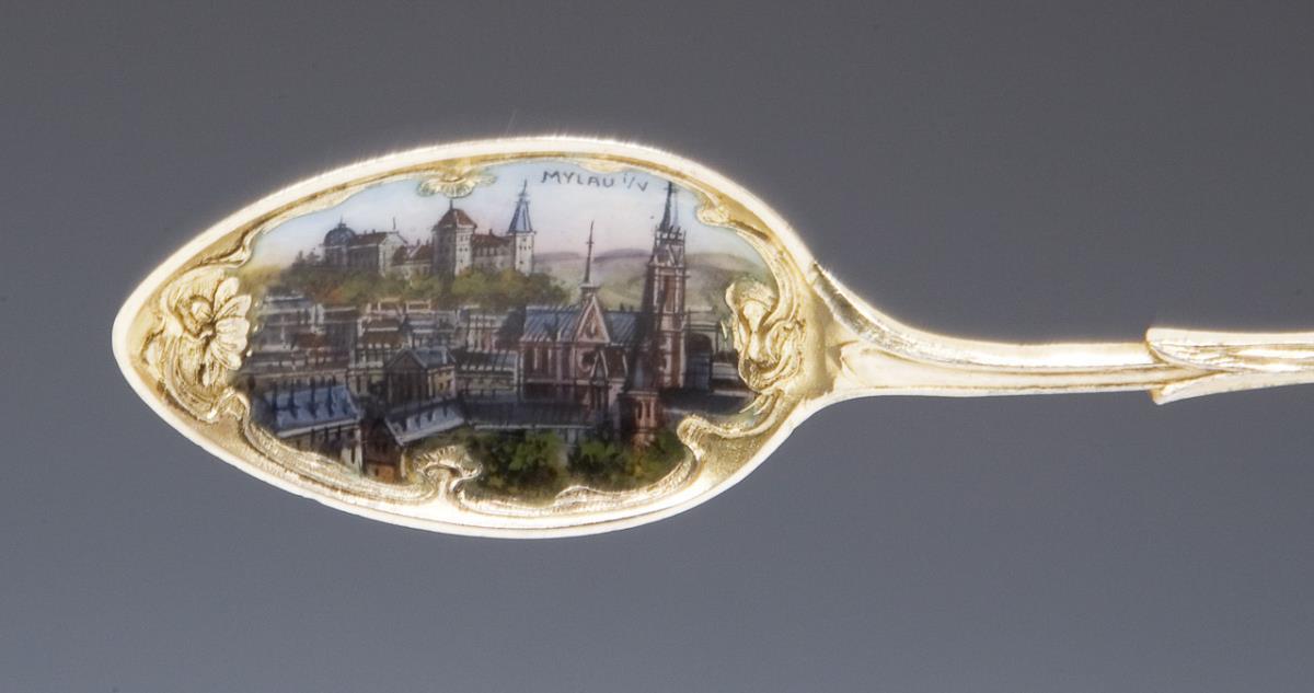 Openwork, relief. Two spoons with colored enamel views, one spoon engraved: Carlsbad 1898. 8 pieces of miscellaneous serving ware, 4 coffee spoons. Hallmarks: Fineness, some with crescent and crown, two spoons Vienna 1872-1921.