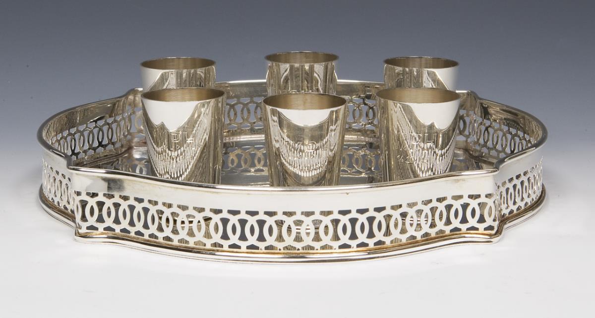 Cup with engraved monogram W.P.H., dated: 10/14/1951. Italian four-pass curved tray with ornamental openwork rim. Hallmarks: Fineness, factory marks, cup with crescent and crown.