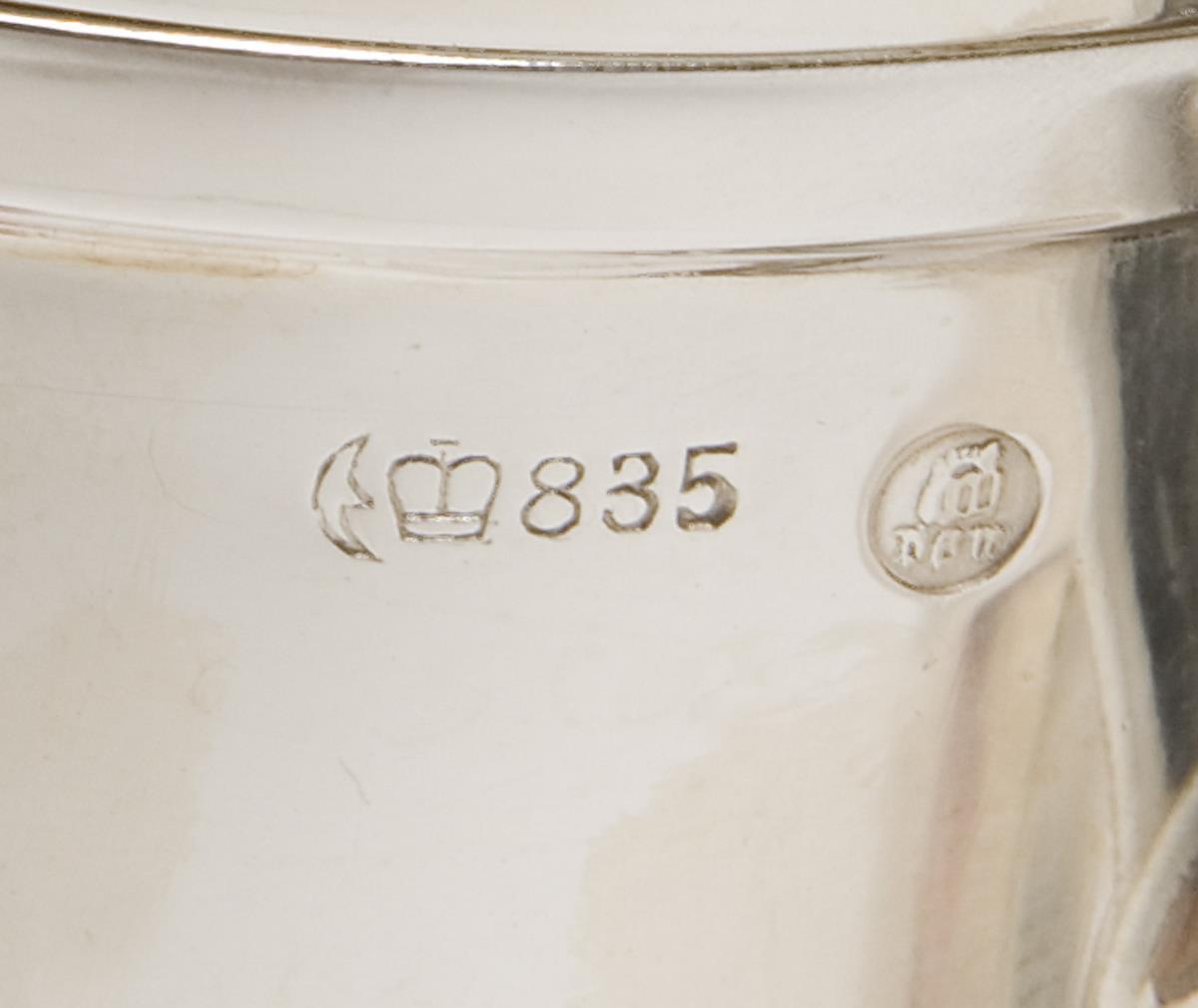 Timeless smooth body with profiled lip. Hinged lid with C-shaped pusher. On the lid angel coat of arms in relief with runes: not-hagal-laf = emergency anchor, (divine) world and life. Hallmarks: Crescent and crown, fineness, unknown mark.