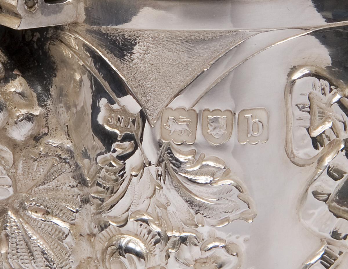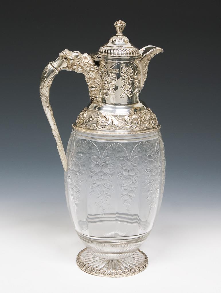 Colorless glass with flower and bow decoration. Elaborately worked silver mount in relief with hinged lid, spout, handle and foot stand ring, partially openwork.