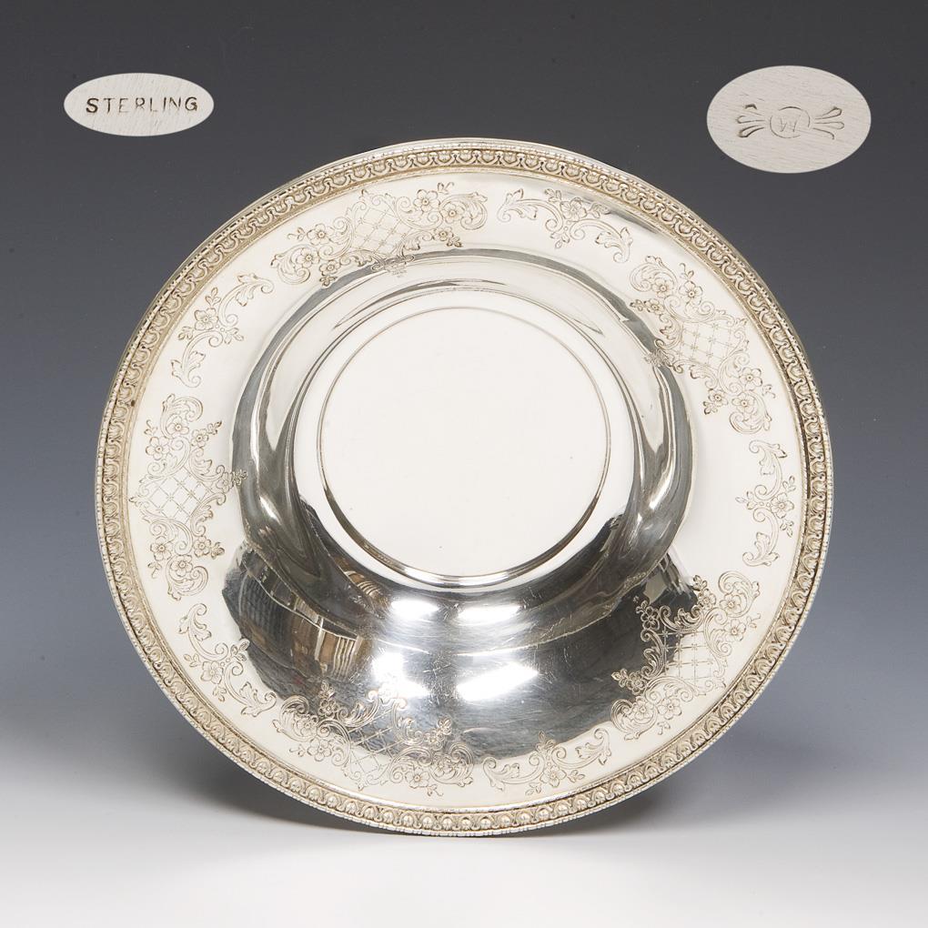 Round moulded shape with floral and ornamental engraved flag, full relief rim. Hallmarks: Fineness, factory mark. In the mirror partial scratches.
