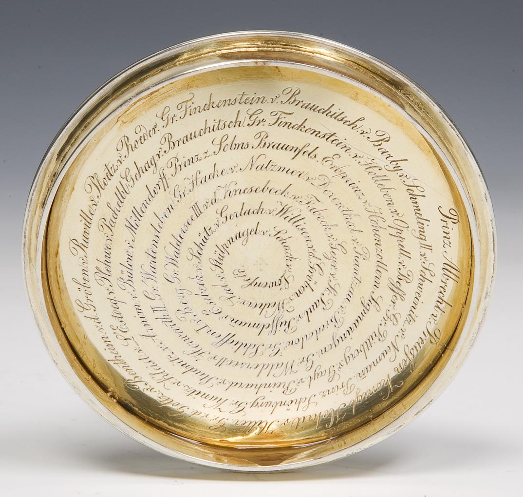 Frontal applied relief coat of arms, reverse engraved dedication to Major von Fabeck. In the lid spiral engraved name inscription dedicated to Prince Albrecht of Prussia Royal Highness (1809 Königsberg - 1872 Berlin, son of King William III and Queen Luise, brother of Kings Frederick William IV and William I). Hallmarks: 1st drawing master Johann Wilhelm David Friedrich, 2nd drawing master Lars Thomas Wendelboe, master mark, fineness, tremmulierstrich. A scratch on the inner lid.