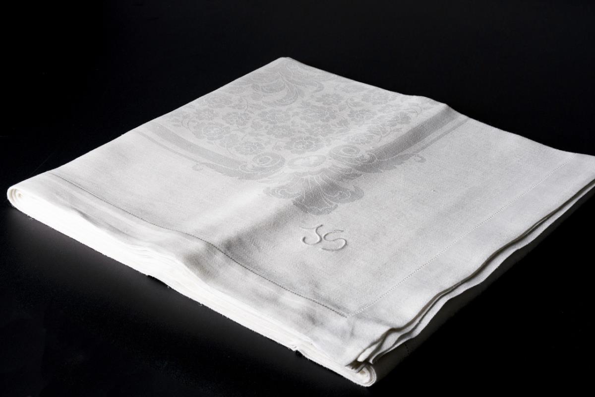 Tablecloth with rose petals and hemstitch.