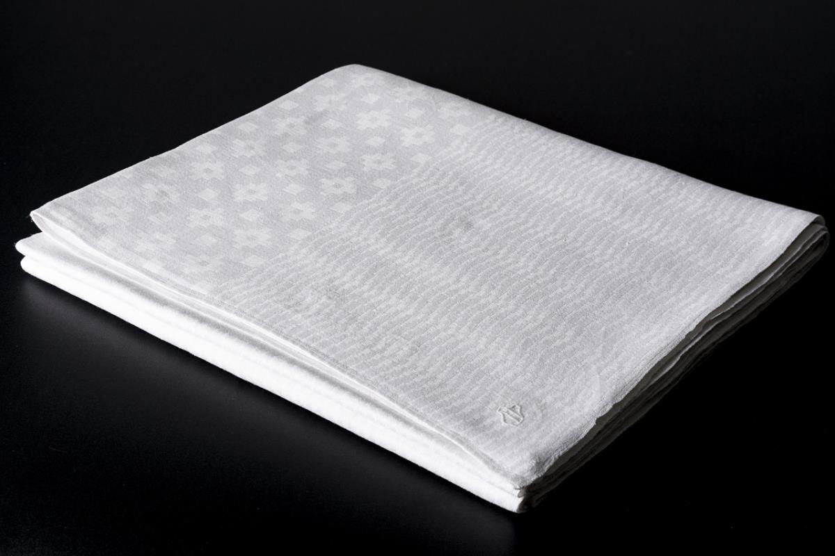On the long sides a wide border of smallest geometricizing wavy lines. In the central area continuous small geometric cross formations, alternating with small squares. In one corner small embroidered Baden coat of arms.