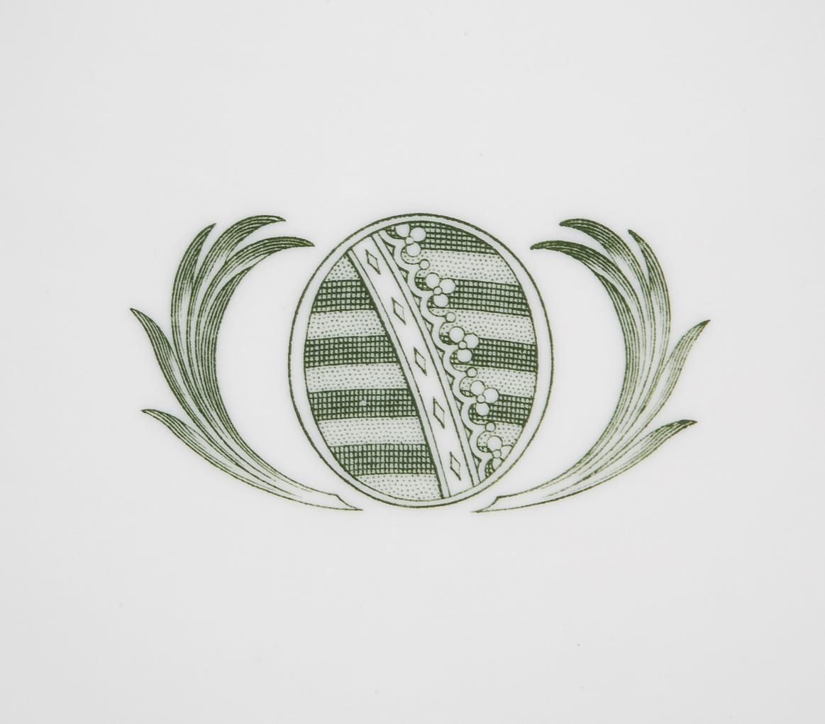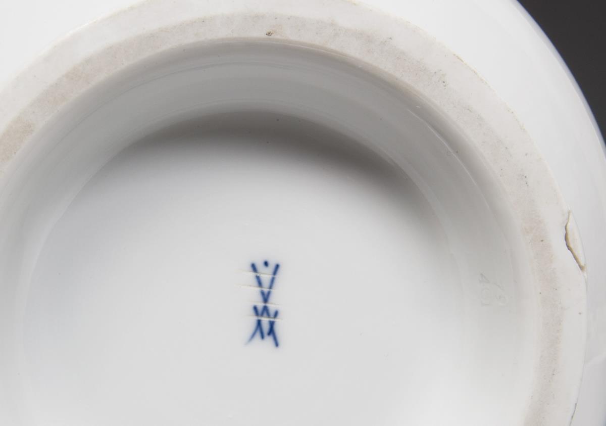 Model by Ernst August Leuteritz and associates 1860-1863. White porcelain, front printed coat of arms in green. Curved ribbon handle on relief leaf rosette. Press marks, sword mark with dot painted four times. Fire crack at the base of the stand.