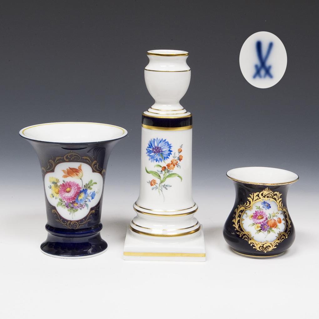 Three parts: Candlestick, 2 small cobalt fond vases. Colored floral painting, gold staffage, vases frontal with curved gold reserves, candlestick with cobalt blue rim decoration. Sword marks.