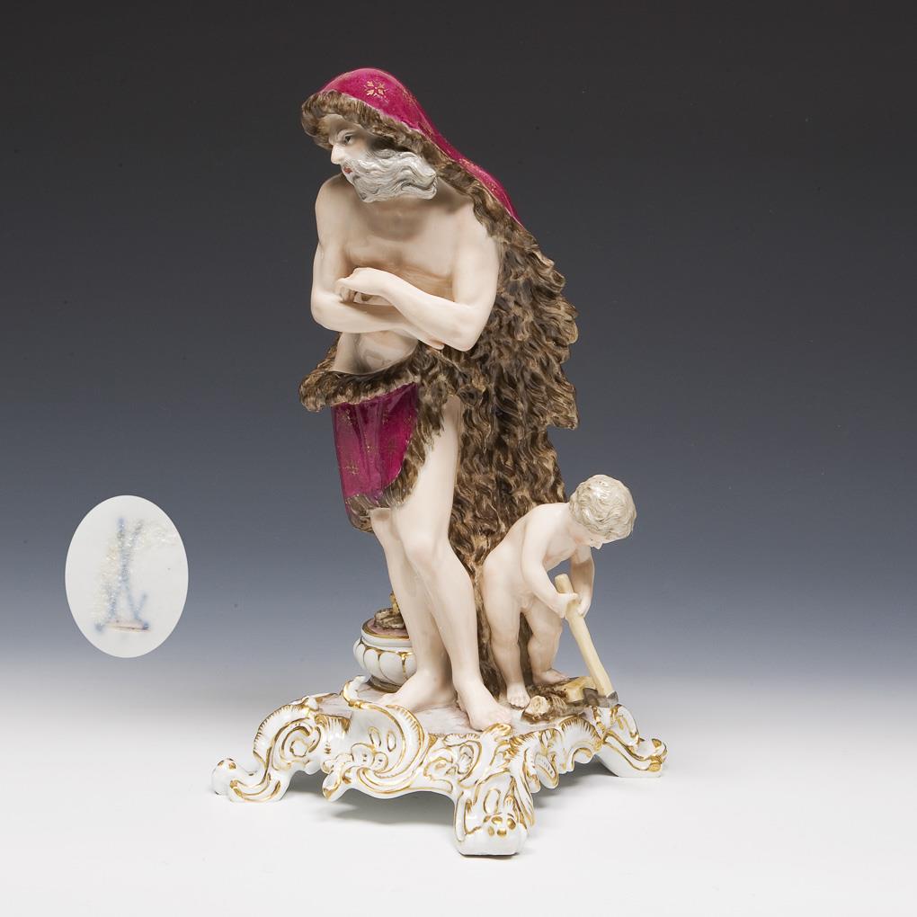 Model by Johann Friedrich Eberlein 1745. From a series of four seasons figures, colorfully painted, gold painted. Incised mark, press mark, painter's mark, sword mark once painted. Partially small fire cracks.