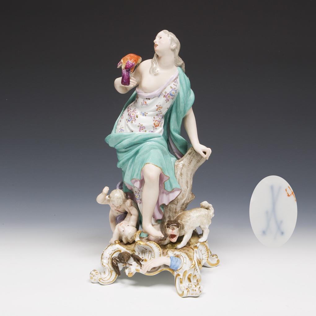 Model by Friedrich Eberlein 1748. From a series of five figures: hearing (ears), smell (nose), taste (tongue), face (eyes), feeling (skin), painted in color, gold painted. Incised mark, painter's mark, sword mark. One wing, one toe, antennae bumped.