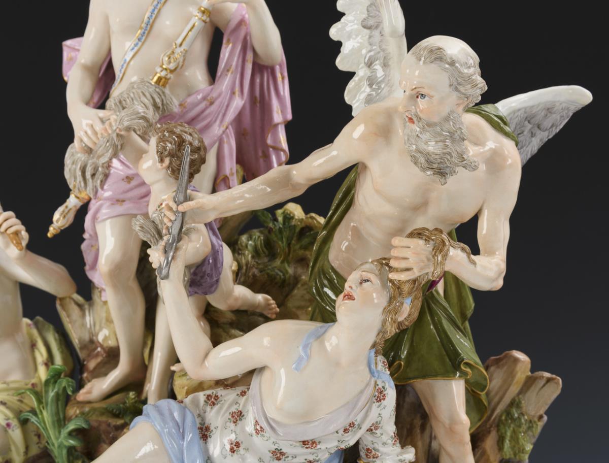 Model by Johann Joachim Kaendler 1774. from the "Great Russian Order" for Tsarina Catherine II. From a series of 40 groups. Painted in colors, painted in gold. Center mounted 2-piece base. Incised marks, press marks, painter's marks, sword marks. One forearm, one hand, one corner of the base, few leaves, spindle restored, a strand of hair from below, few leaves, two fingers bumped (fingers loose present).
