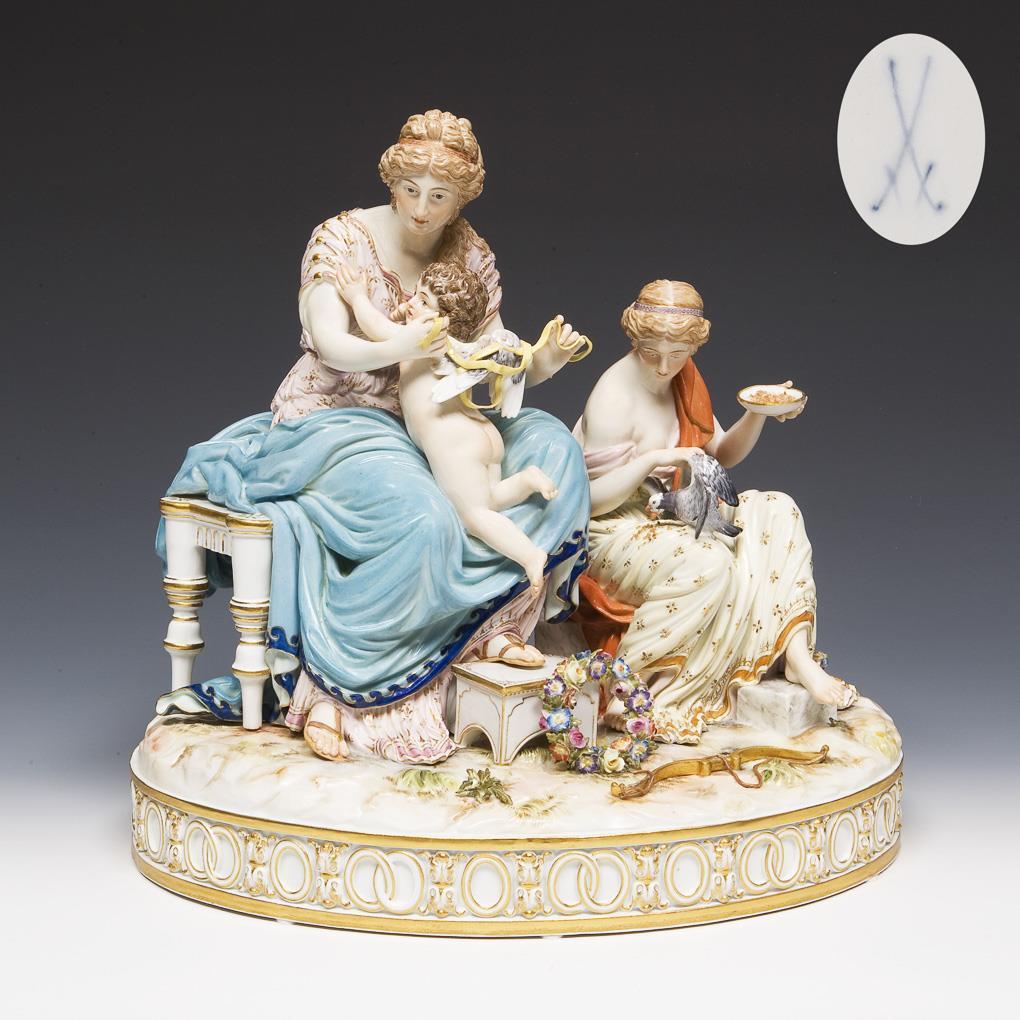 Model by Christian Gottfried Jüchtzer 1788-1789. Pendant to model no. I 82, H 95 "Amor in Nöten" and "The Love Market". Painted in colors, painted in gold. Unglazed base, incised mark, press mark, painter's mark, sword mark. bands, tail feathers, bow, quiver, some leaf restored, some leaf bumped.