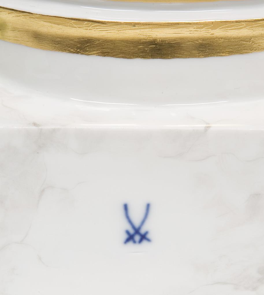 Model by Christian Gottfried Jüchtzer 1785. Colorfully painted, gold painted. Press marks, painter's mark, sword mark once painted at the base. Flower, leaflets bumped.
