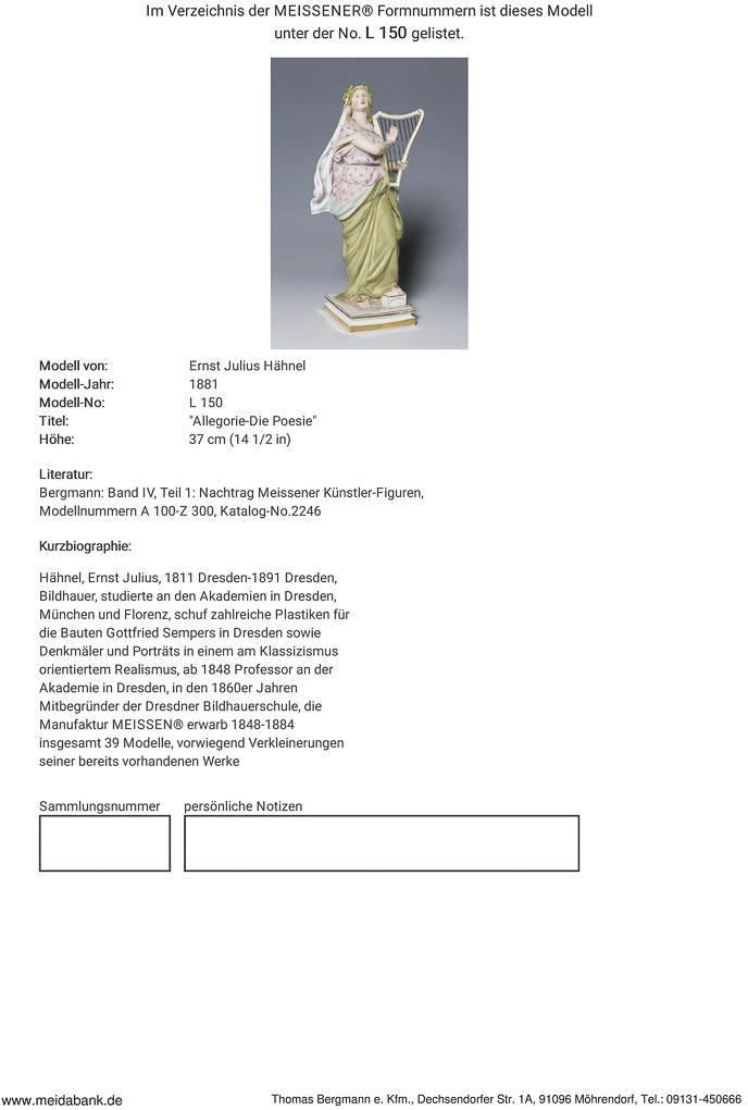 Hähnel, sculptor, studied at the academies in Dresden, Munich and Florence. From 1848 professor at the academy in Dresden. Meissen acquired 1848-1884 a total of 39 models, mainly reductions of his existing works * Partner auction Bergmann.