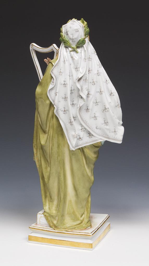 Model by Ernst Julius Hähnel 1881. colored painted, gold painted. Incised mark, press mark, painter's mark, sword mark. Lorbeer, a forearm, hands, lyre, base rim partially restored, partially small glaze defects.