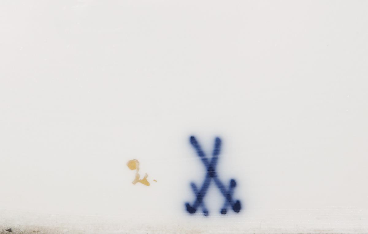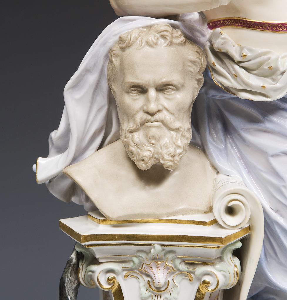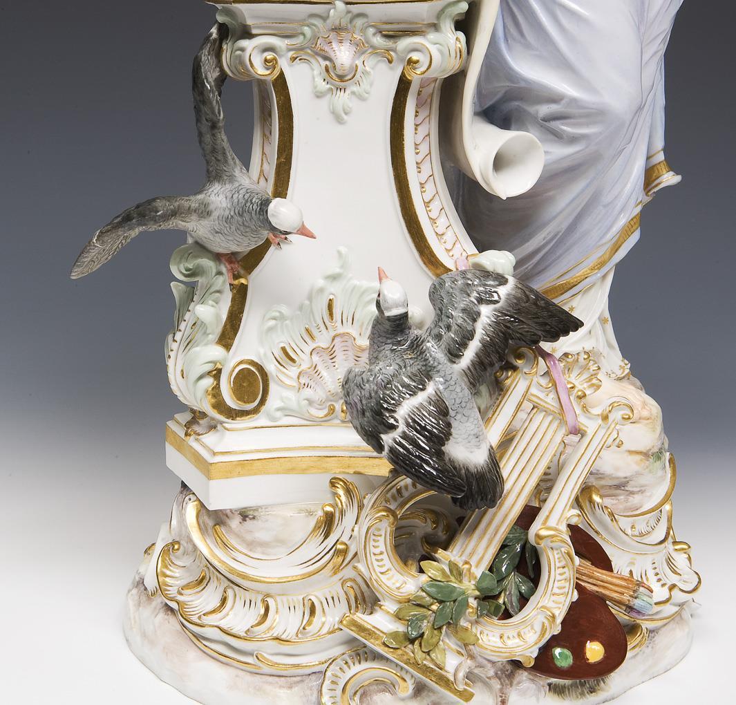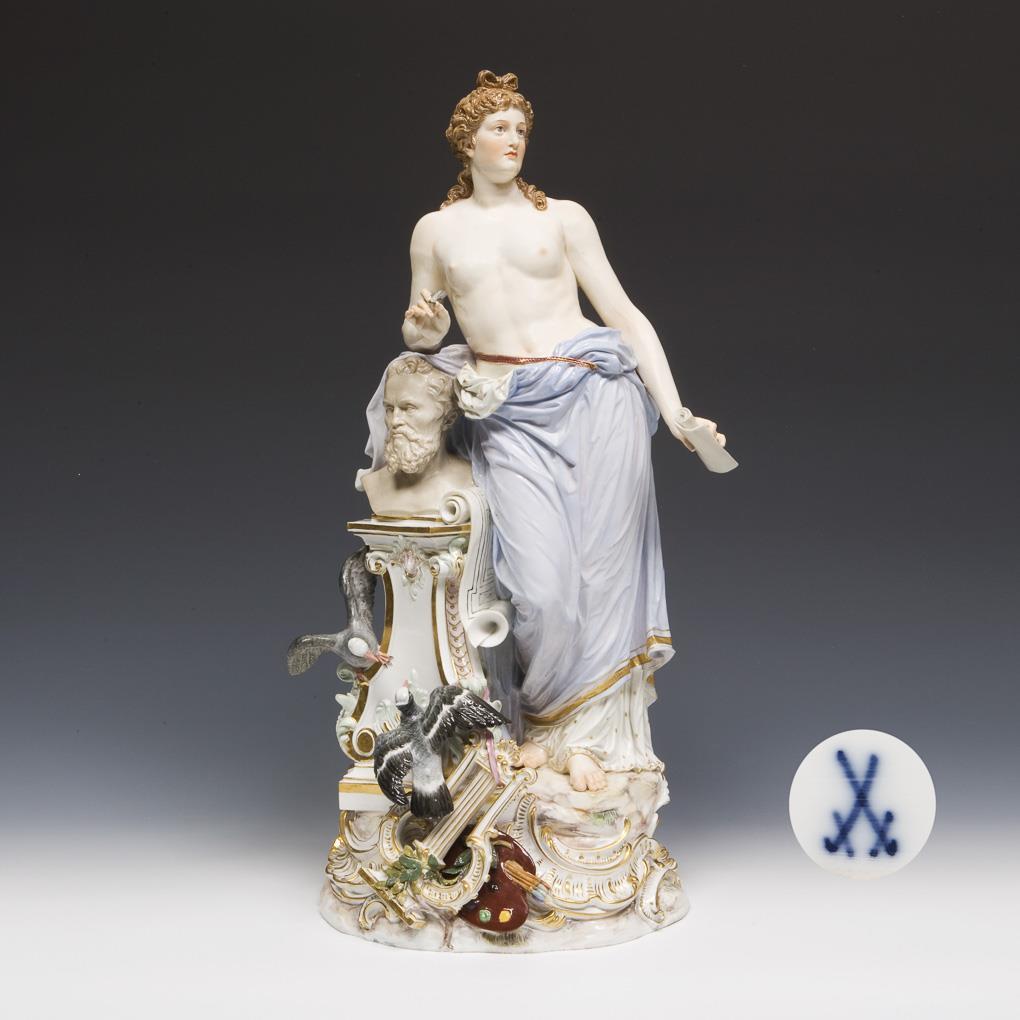 Model by Emmerich Andresen 1889-1890. counterpart to model no. P 136 "Allegory-The Science". Colorfully painted, gold painted. Incised mark, press mark, painter's mark, sword mark, artist's signet. Leaves, fingers of both hands, scroll, pen, one wing restored, the restored wing glued.