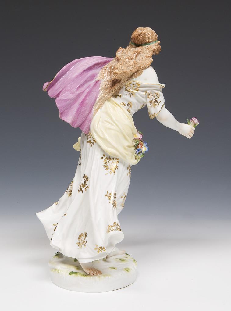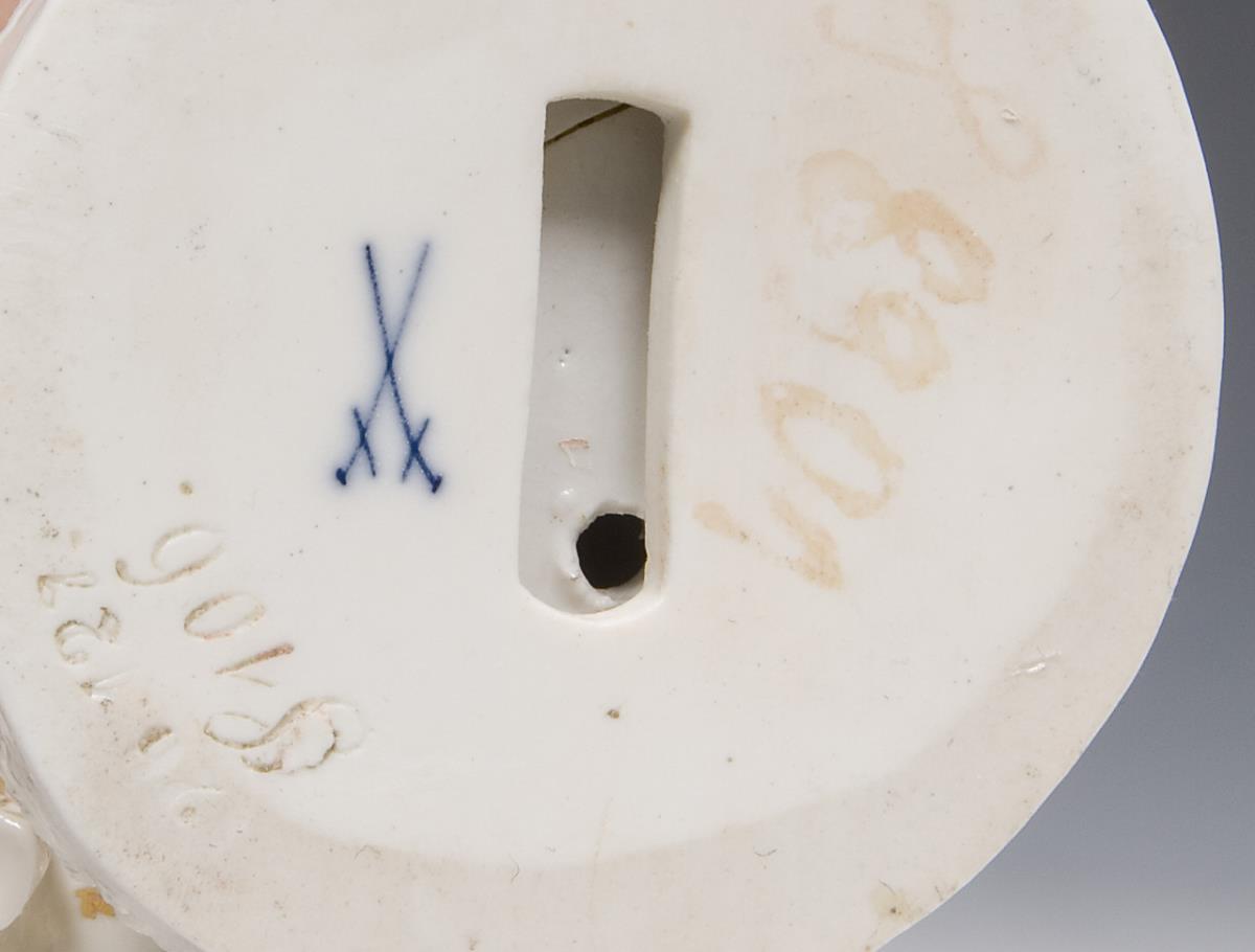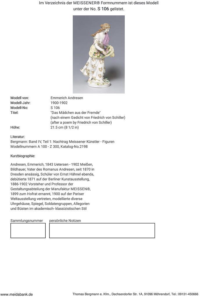 Model by Emmerich Andresen 1900-1902. figure from the poem by Friedrich von Schiller. Painted in color, gold painted. Unglazed base, incised mark, pressed mark, sword mark. Flower, stole and hair strand restored on the back, a cloth tail minimal, leaves bumped from below.