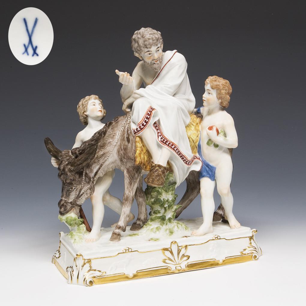 Model by Heinrich Möller 1898. Aesop, Greek fable poet around 600 BC. Painted in color, gold painted. Incised mark, press mark, painter's mark, sword mark. Mane, ears and tail with rope, a boy's upper body, a leaf, staff tip restauirert, hairline crack on an ankle.