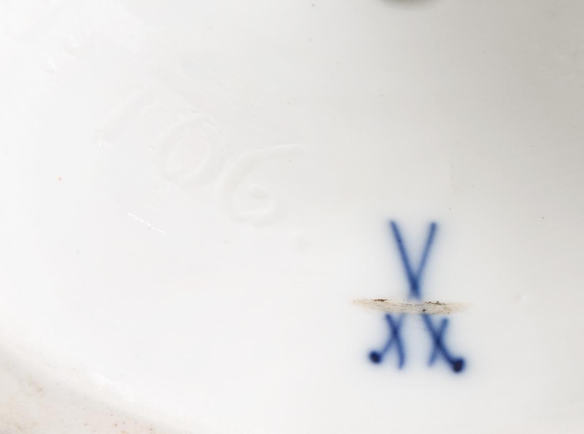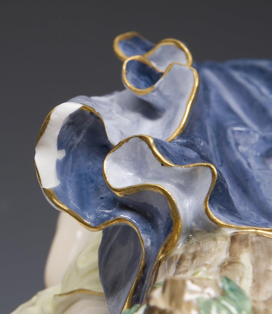 Model by Emmerich Andresen 1893. From a series of four figures: dawn, day, evening and night. Painted in colors, gold painted. Incised mark, sword mark once deleted. One hand, crown, few leaves restored, cape bumped from below.