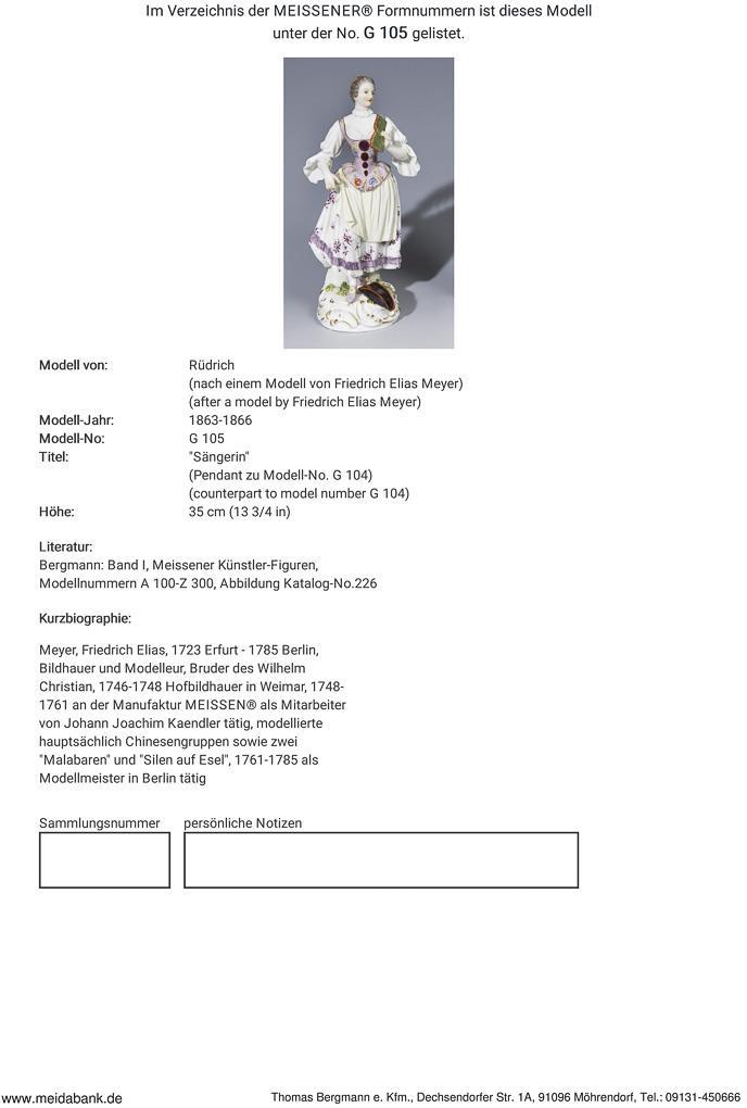 Model by Rüdrich 1863-1866 (after a model by Friedrich Elias Meyer). Counterpart to model no. G 104 "Singer". Painted in colors, painted in gold. Incised mark, press mark, painter's mark, sword mark. Book glued, minimally bumped.