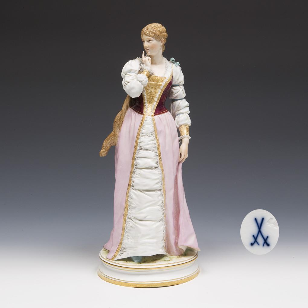 Model by Johannes Daniel Schreitmüller 1885. Pendant to model no. N 165 "Singer with lute". Colorfully painted, gold painted. Incised mark, press mark, painter's mark, sword mark. Tip trim bumped, one hand, bow restored, in the base small burn crack.