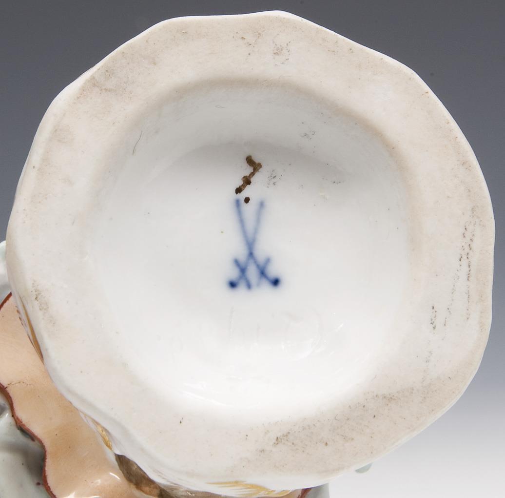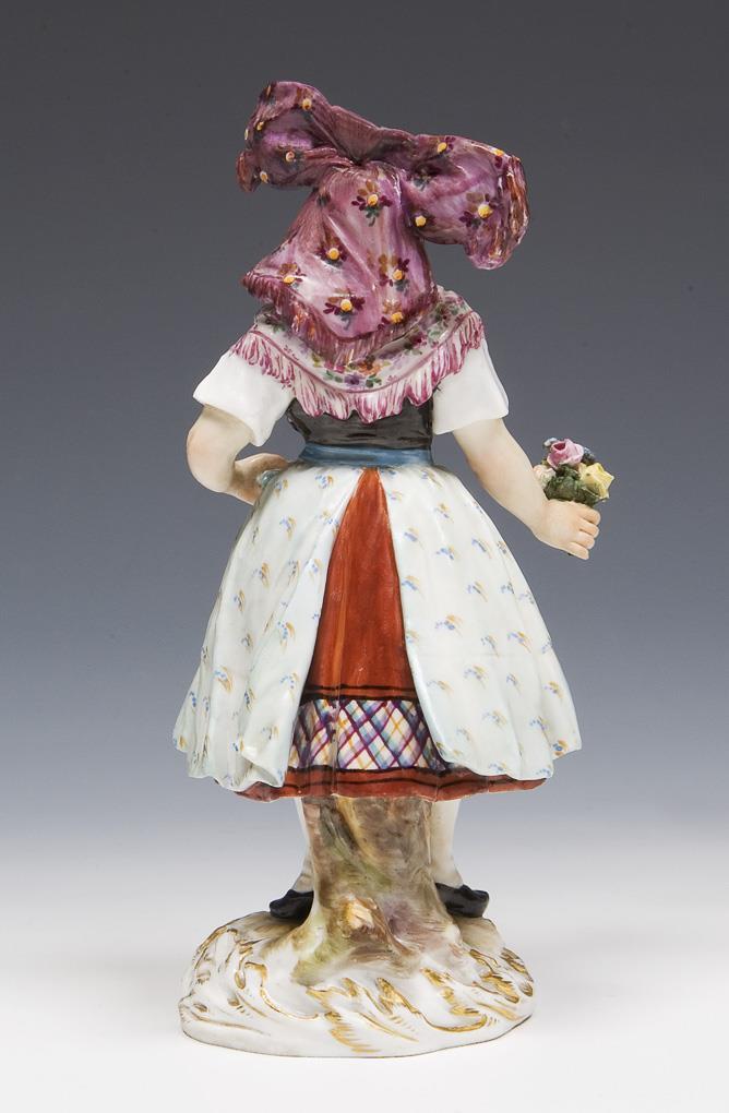 Model by Hugo Spieler 1897-1898. From a series of 25 traditional costume figures. Painted in colors, painted in gold. Incised mark, press mark, painter's mark, sword mark. Skirt, bouquet and headscarf partially, one hand restored, some leaves bumped.
