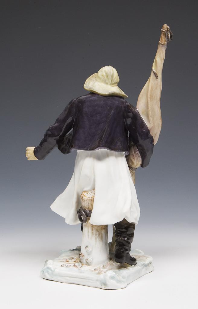 Model by Hugo Spieler 1897-1898. From a series of 25 traditional costume figures. Painted in color, incised mark, pressed mark, painter's mark, sword mark. hands, one forearm, flag tip restored.