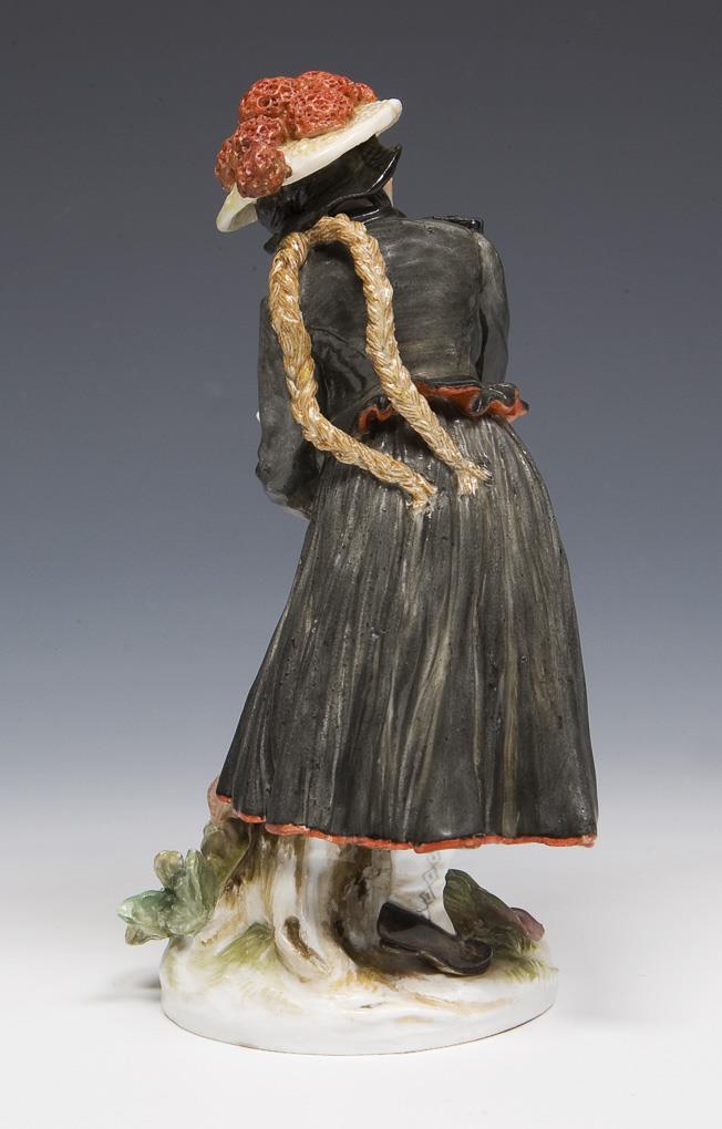 Model by Hugo Spieler 1897-1898. From a series of 25 traditional costume figures. Painted in color, incised mark, pressed mark, painter's mark, sword mark. Spade, one leaf, hat partially restored.