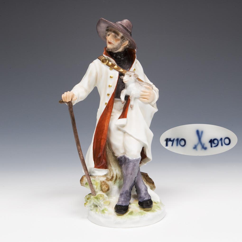 Model by Hugo Spieler 1897-1898. From a series of 25 traditional costume figures. Painted in colors, painted in gold. Incised mark, press mark, painter's mark, sword mark, anniversary mark. Stick minimally bumped, pommel restored.