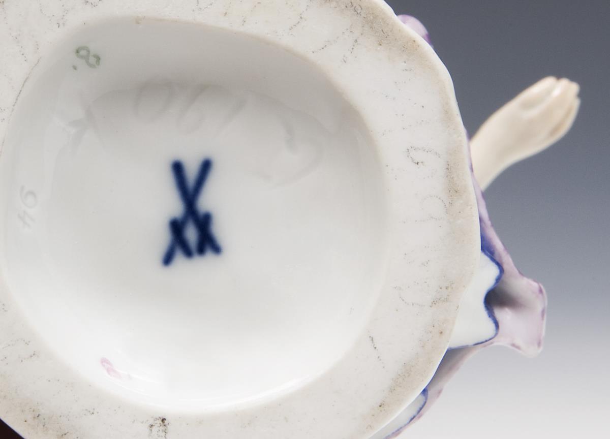 Model by Hugo Spieler 1897-1898. From a series of 25 traditional costume figures. Painted in color, incised mark, pressed mark, painter's mark, sword mark. One arm restored, cloth tail in hand missing.