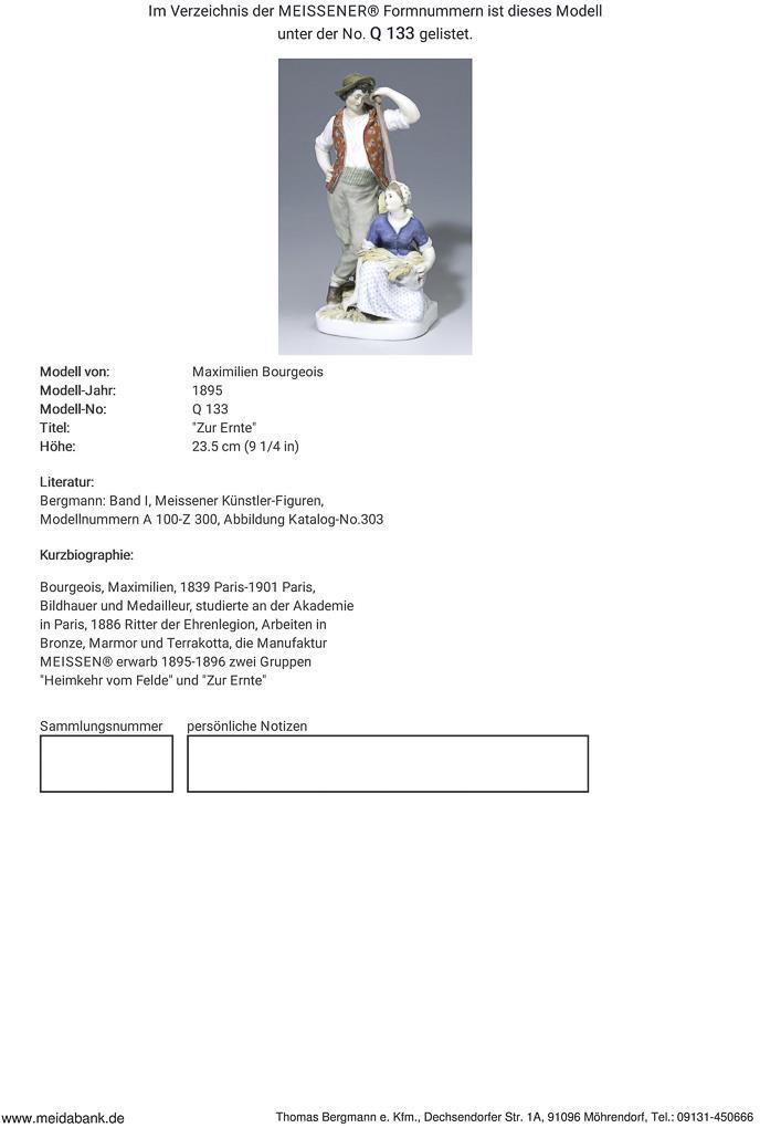 Bourgeois, sculptor and medalist, studied at the Academy in Paris. 1886 Knight of the Legion of Honor. Meissen acquired two groups in 1895-1896 * Partner auction Bergmann.