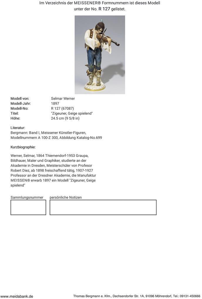 Model by Selmar Werner 1897. Painted in color, gold painted. Incised mark, press mark, painter's mark, sword mark. One hand, staff, violin bridge, fur trim restored, staff bumped, loose present.