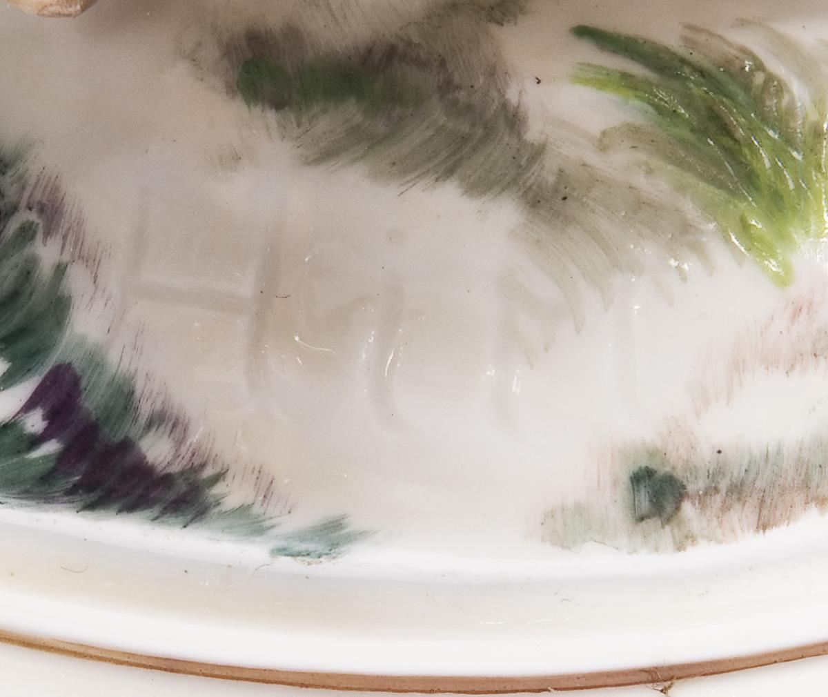 Model by Johann Christian Hirt 1880-1882. painted in color. Incised mark, press mark, painter's mark, sword mark, artist's signet. An acorns, leaves, muzzle, one ear restored, two burn cracks in the knit.