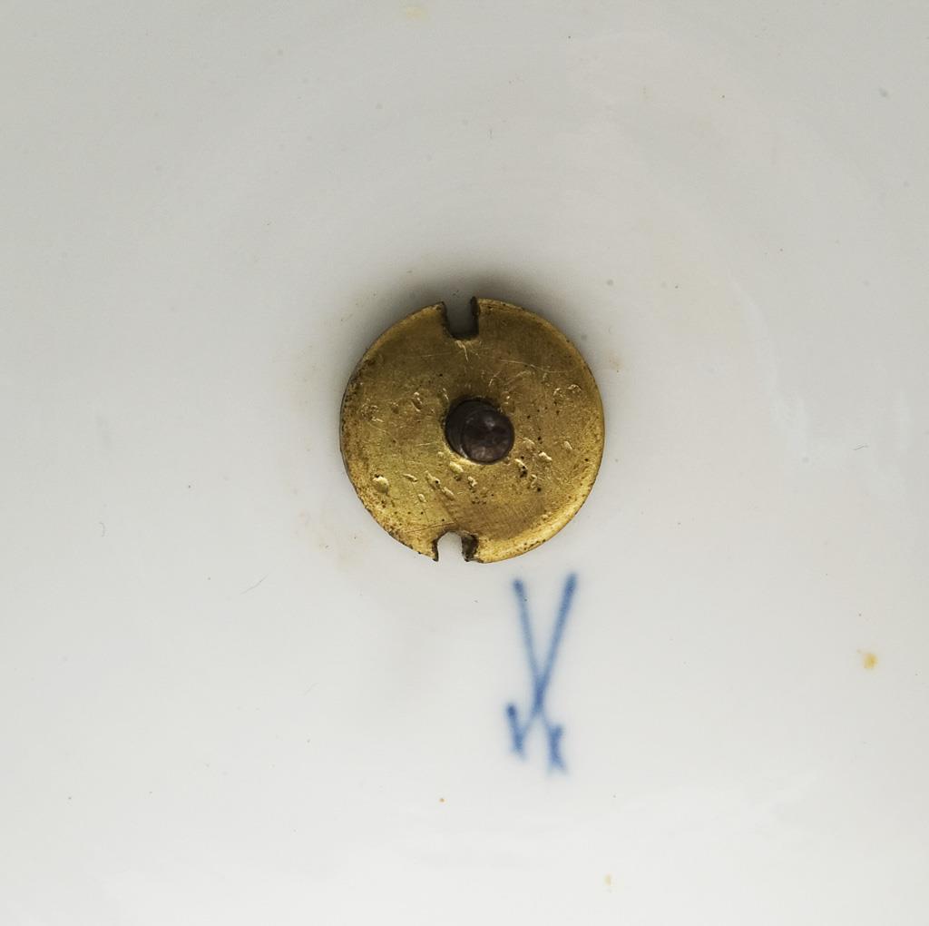 Model by Rudolf Hölbe 1885. counterpart to model no. N 196 "Psyche". Colorfully painted, gold painted, mounted plinth. Press mark, sword mark, indistinct artist's signet. Birds nest with branch and upper leaves, leaves restored.