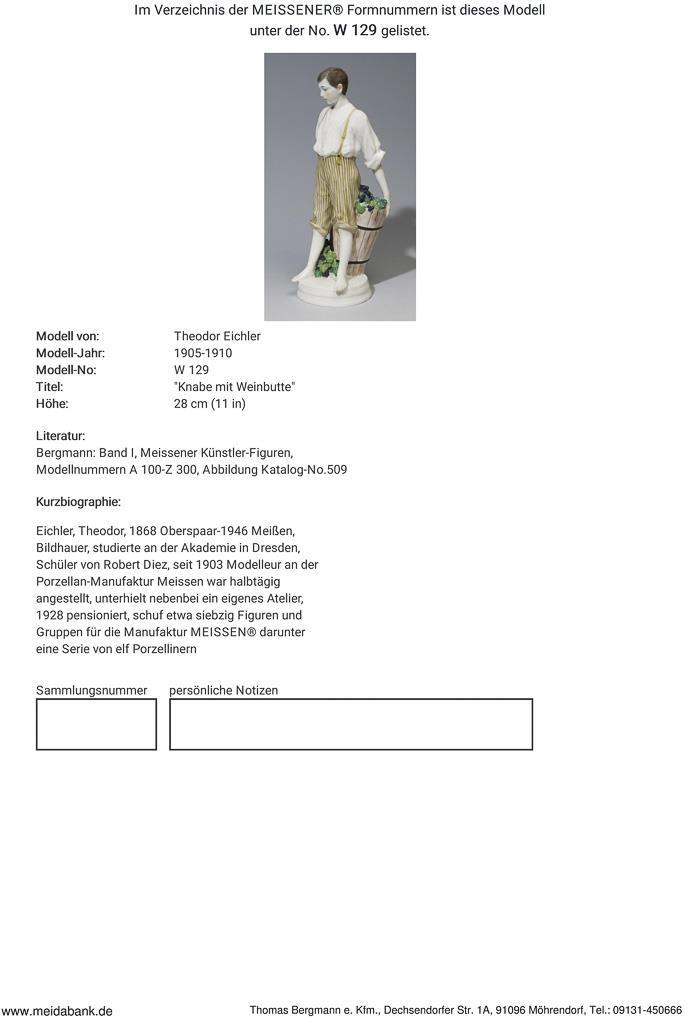Eichler, sculptor, studied at the Academy in Dresden. Pupil of Robert Diez, since 1903 modeller in Meissen, was employed part-time, maintained his own studio on the side, retired in 1928 * Partner auction Bergmann.