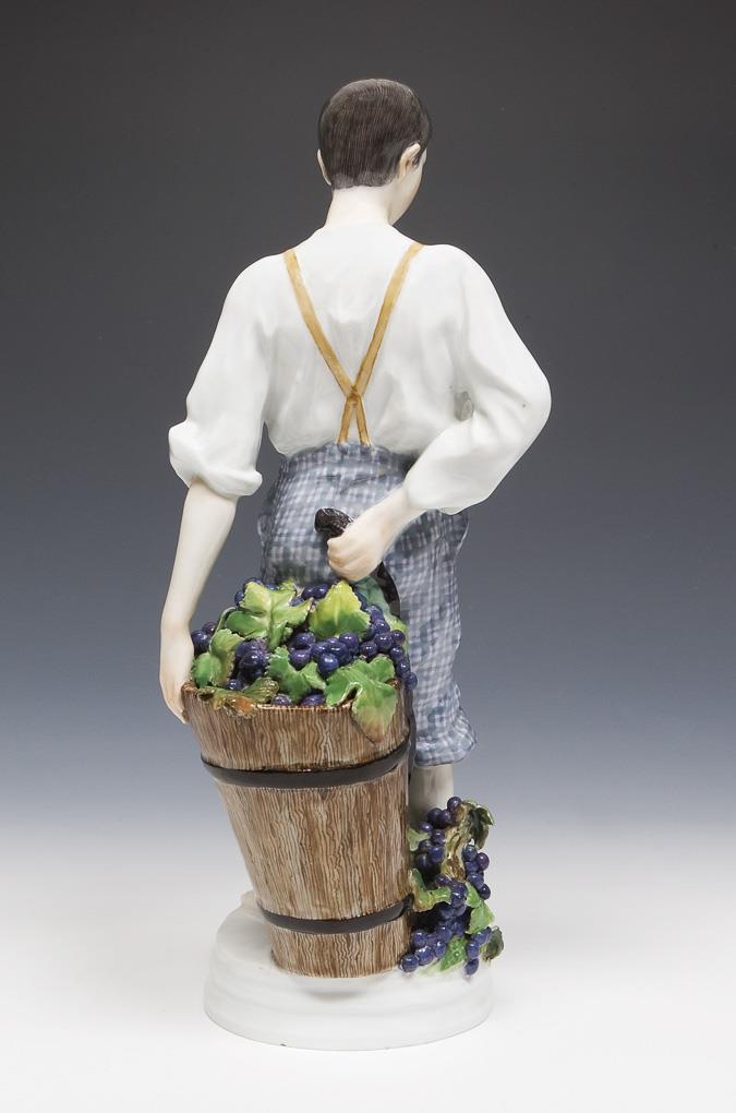 Model by Theodor Eichler 1905-1910. colored painted. Incised mark, press mark, sword mark. Bunches of grapes, leaves, feet, base, head, neck restored, base minimally bumped.