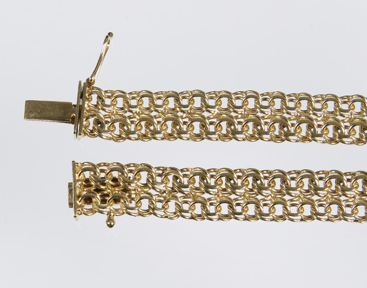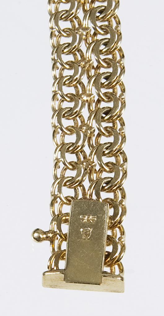 Double row, made of fine mesh. Box clasp with eyelet. Hallmarks: Fineness, indistinct master mark.