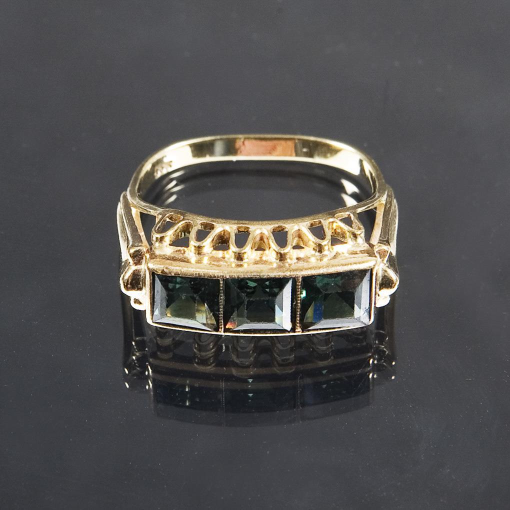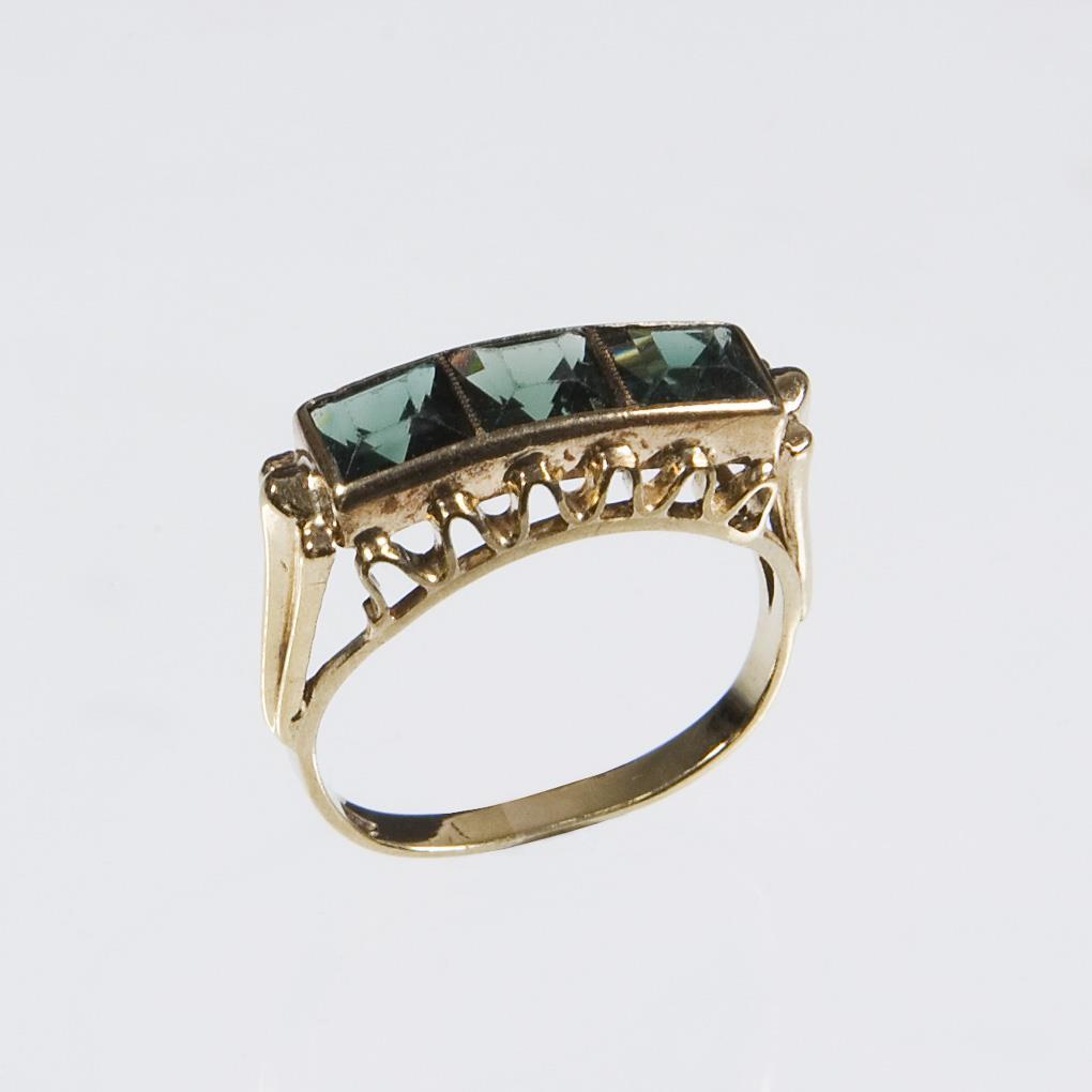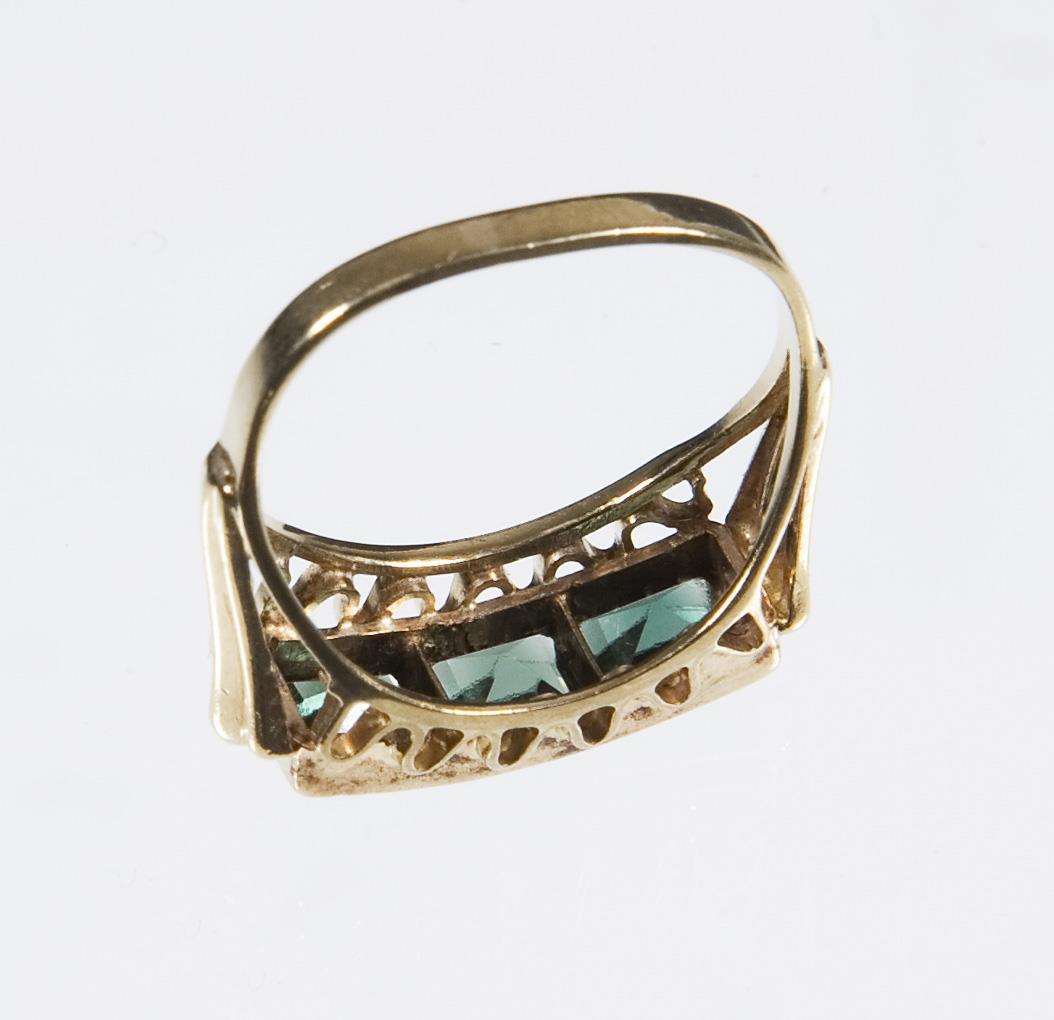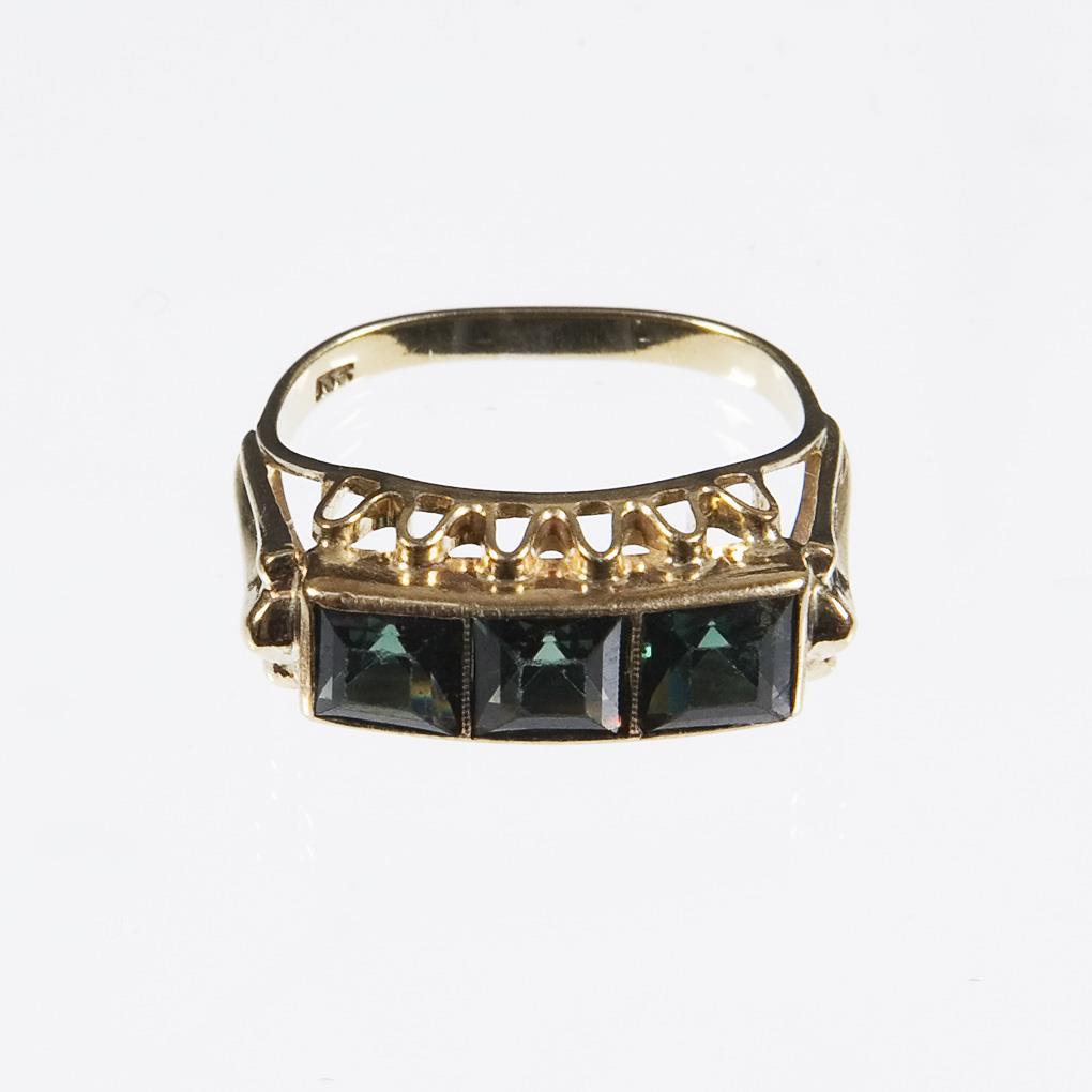 Three dark green faceted carrés, narrow bar. Hallmarks: Fineness.