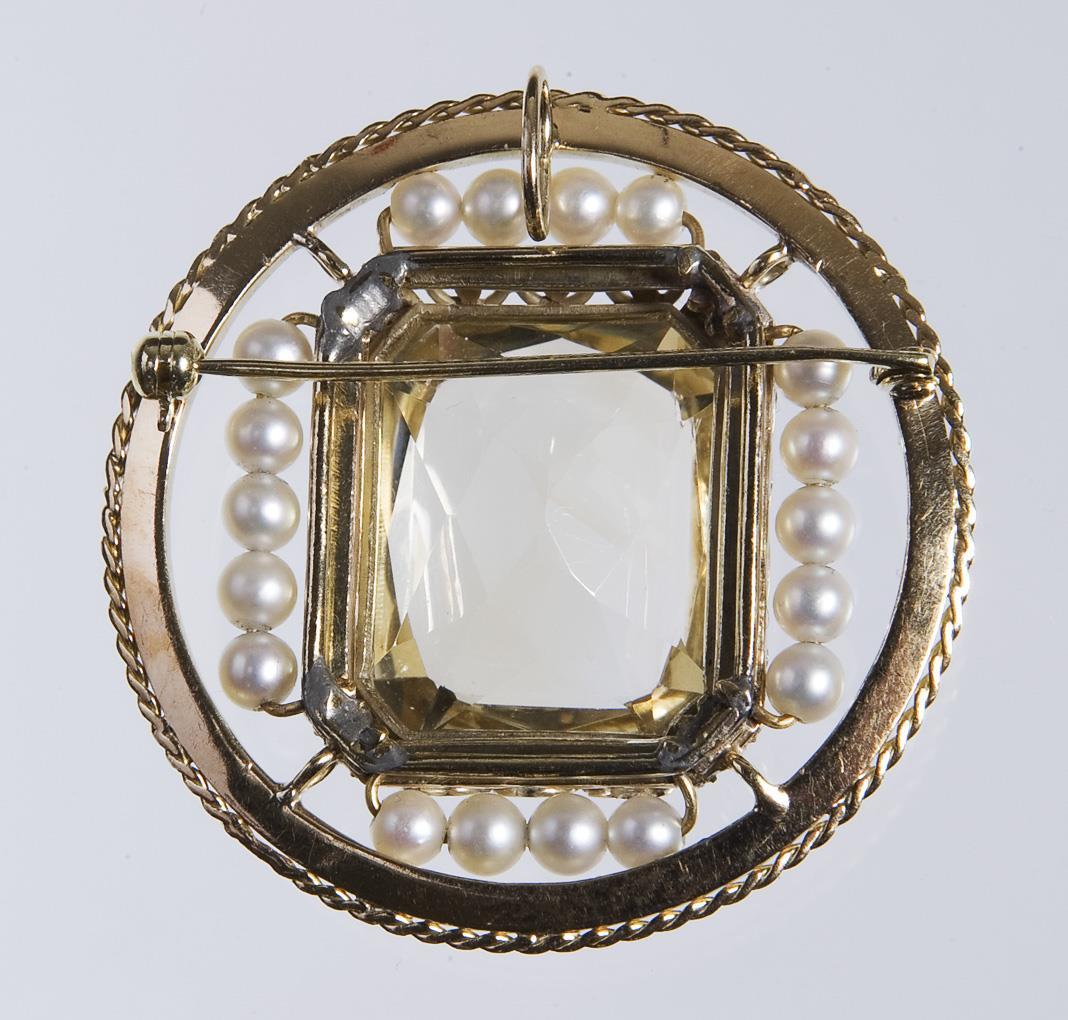Pale yellow faceted citrine circa 22 x 18 mm. 18 beads, fixed loop on the back, can also be worn as a pendant. Barely visible hallmark, fineness checked with acid. Soldered corners on the back.
